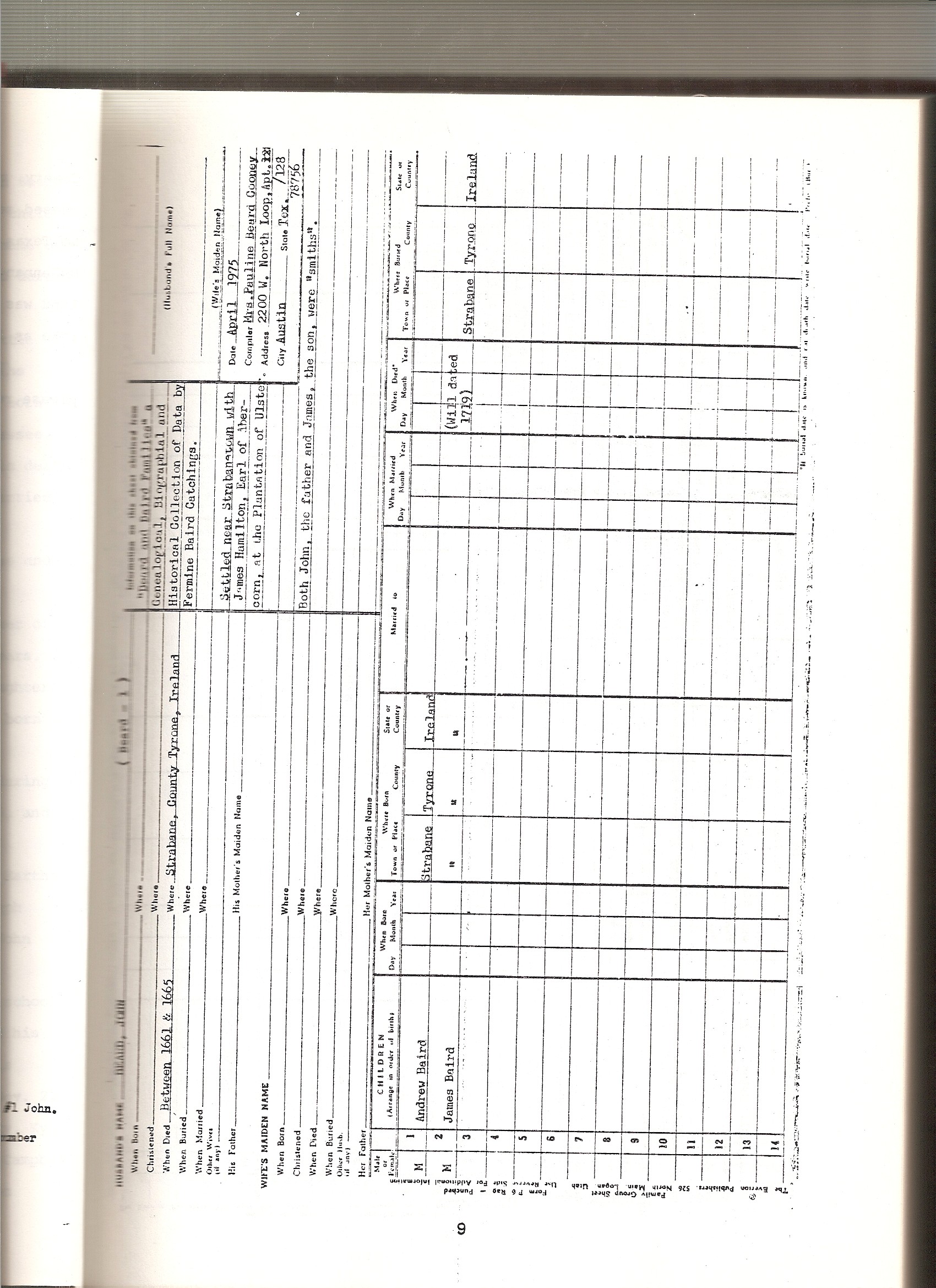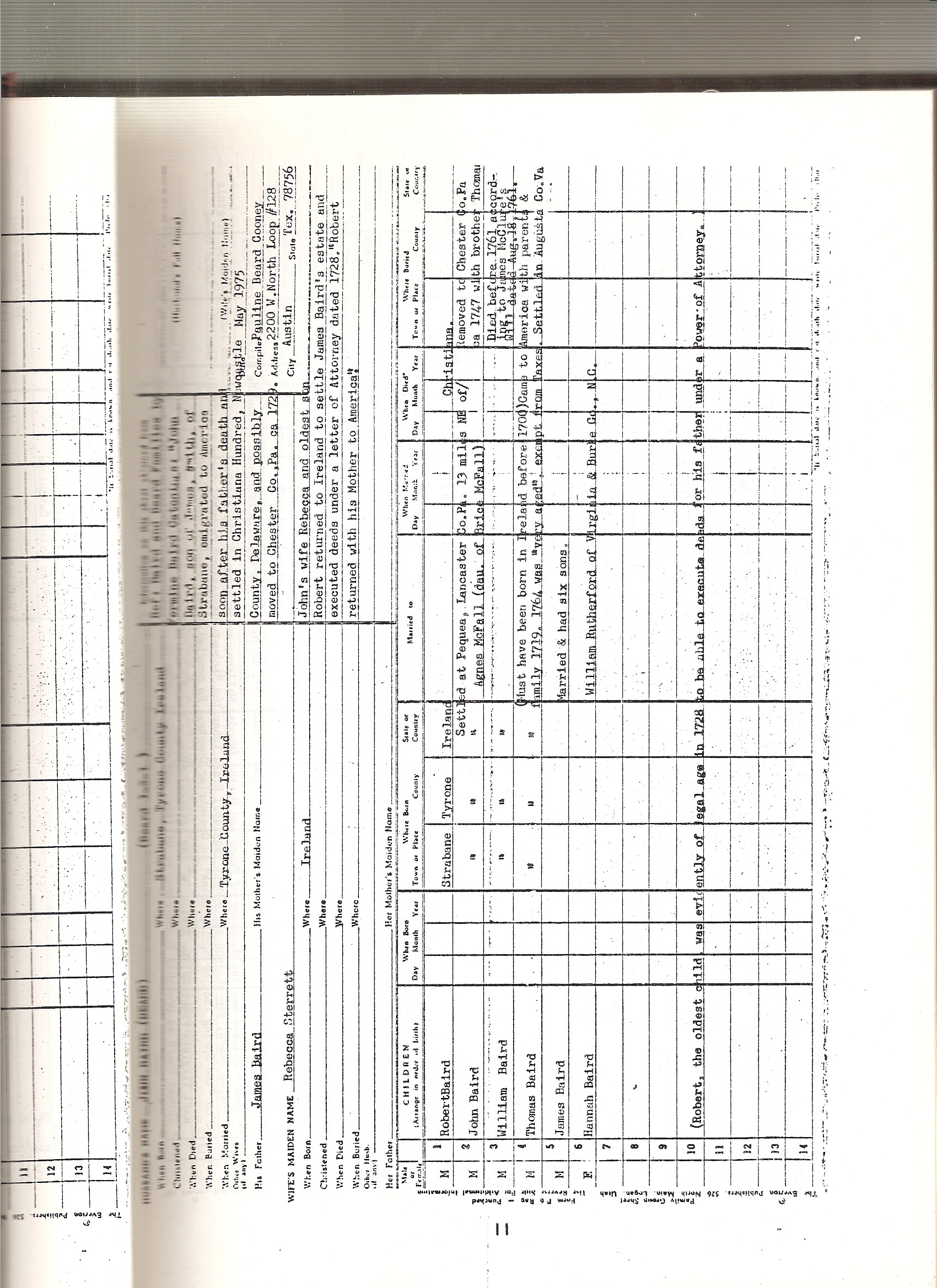 The progenitor of our family is believed to be John Beard (Baird) of Strabane, County Tyrone, Ireland, who died between 1661 and 1665. He had two sons, Andrew and James. "They settled near Strabanetown with James Hamilton, Earl of Abercorn, at the Plantation of Ulster.". [2] (Ref Beard-Baird Families by Fermine Baird Catchings.). James inherited most of his father's property and when he died in 1719 (will dated 1719) he left considerable property to his children, John, William, James Sydney, Rebecca, and Jane. The eldest son John had married Rebecca Sterrett and they had six children, Robert, John, William, Thomas, James and Hannah, all or most of whom were born in Ireland before their parents immigrated to America in 1720, shortly after his father's death. The family settled in Christina Hundred, Newcastle, Delaware, and about 1729 moved to Chester County, PA. In 1729, Rebecca (Sterrett) Baird and her eldest son Robert returned to Ireland to settled the estate of James Baird. Robert was evidently of legal age to be give a Power of Attorney from his father to sell property and settle his grandfather's estate.