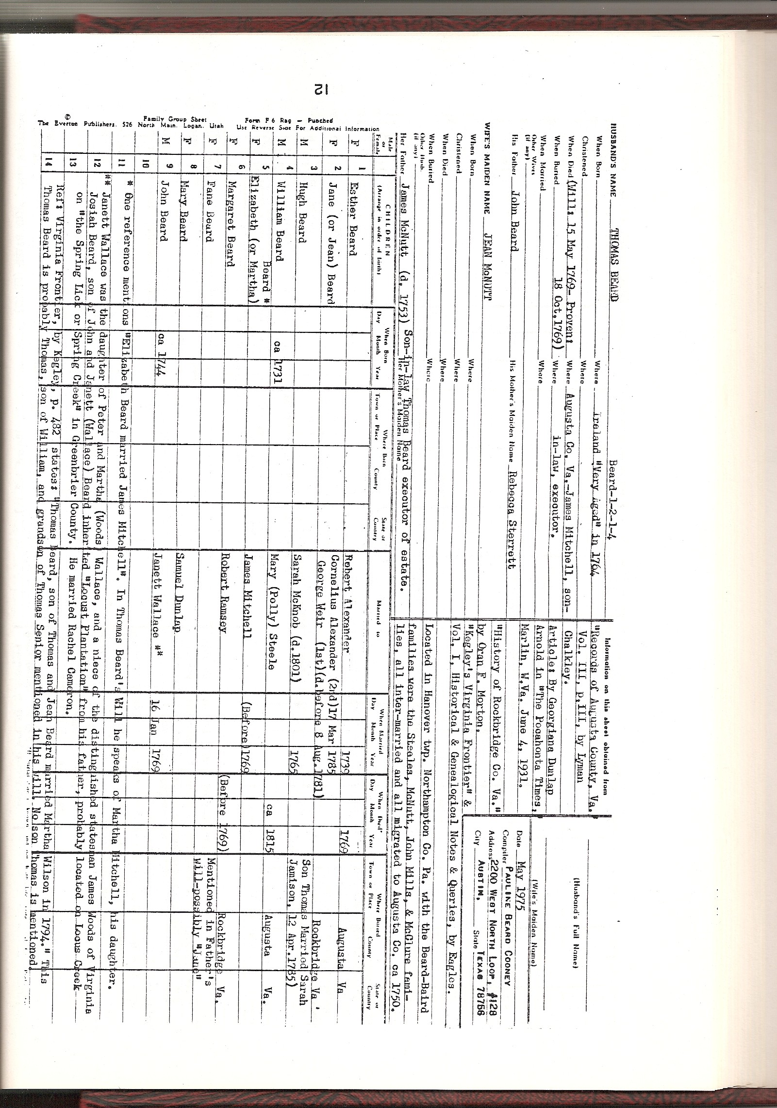 Thomas Beard married Jean McNutt, daughter of Elder James McNutt who died in 1753 and his son-in-law was named executor of his estate. Thomas Beard was "very aged" in 1764 and exempt from taxes, according to Lyman Chalkey in his "Records of Augusta County, Va." [3]. His Will, dated 15 May 1769 and proven 18 October 1769 has his son-in-law James Mitchell as executor.