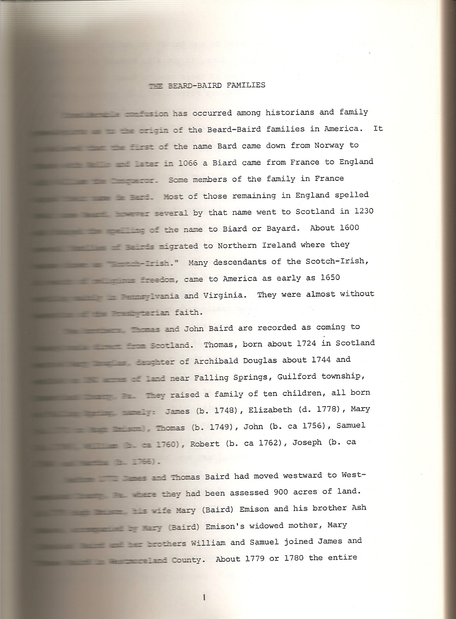 Considerable confusion has occurred among historians and family genealogists as to the origin of the Beard-Baird families in America. It is believed that the first of the name Bard came down from Norway to France with Rollo and later in 1066 a Biard came from France to England with William the Conqueror. Some members o the family in France signed their name de Bard. most of those remaining in England spelled their name Beard, however, several by that name went to Scotland in 1230 and changed the spelling of the name to Biard or Bayard. About 1600 several families of Bairds migrated to Northern Ireland where they became known as "Scotch-Irish." Many descendents of the Scotch-Irish in search of religious freedom, came to America as early as 1650 settling mainly in Pennsylvania and Virginia. They were almost without exception of the Presbyterian faith.