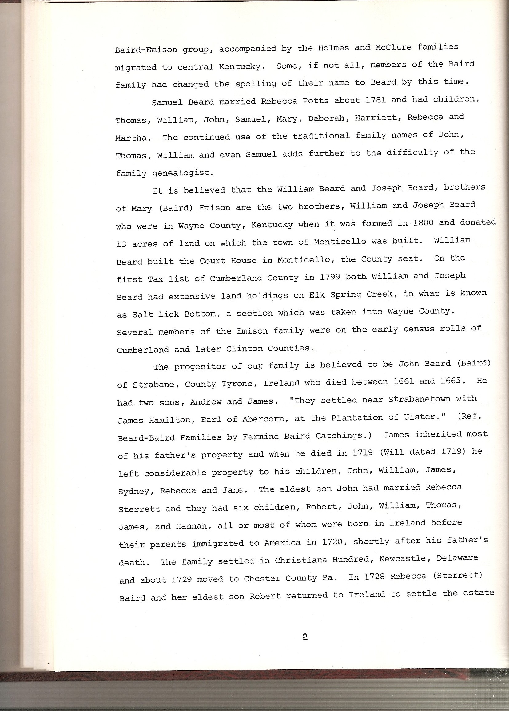Before 1772, James and Thomas Baird had moved westward to Westmoreland County, Pa, where they had been assessed 900 acres of land. In 1775, Hugh Emison, his wife Mary (Baird) Emison, and his brother Ash Emison, accompanied by Mary (Baird) Emison's widowed mother, Mary (Douglas) Baird and her brothers William and Samuel joined James and Thomas Baird in Westmoreland County. About 1779 or 1780 the entire Baird-Emison group, accompanied by the Holmes and McClure families migrated to central Kentucky. Some, if not all, members of the Baird family had changed the spelling of their name to Beard by this time.
