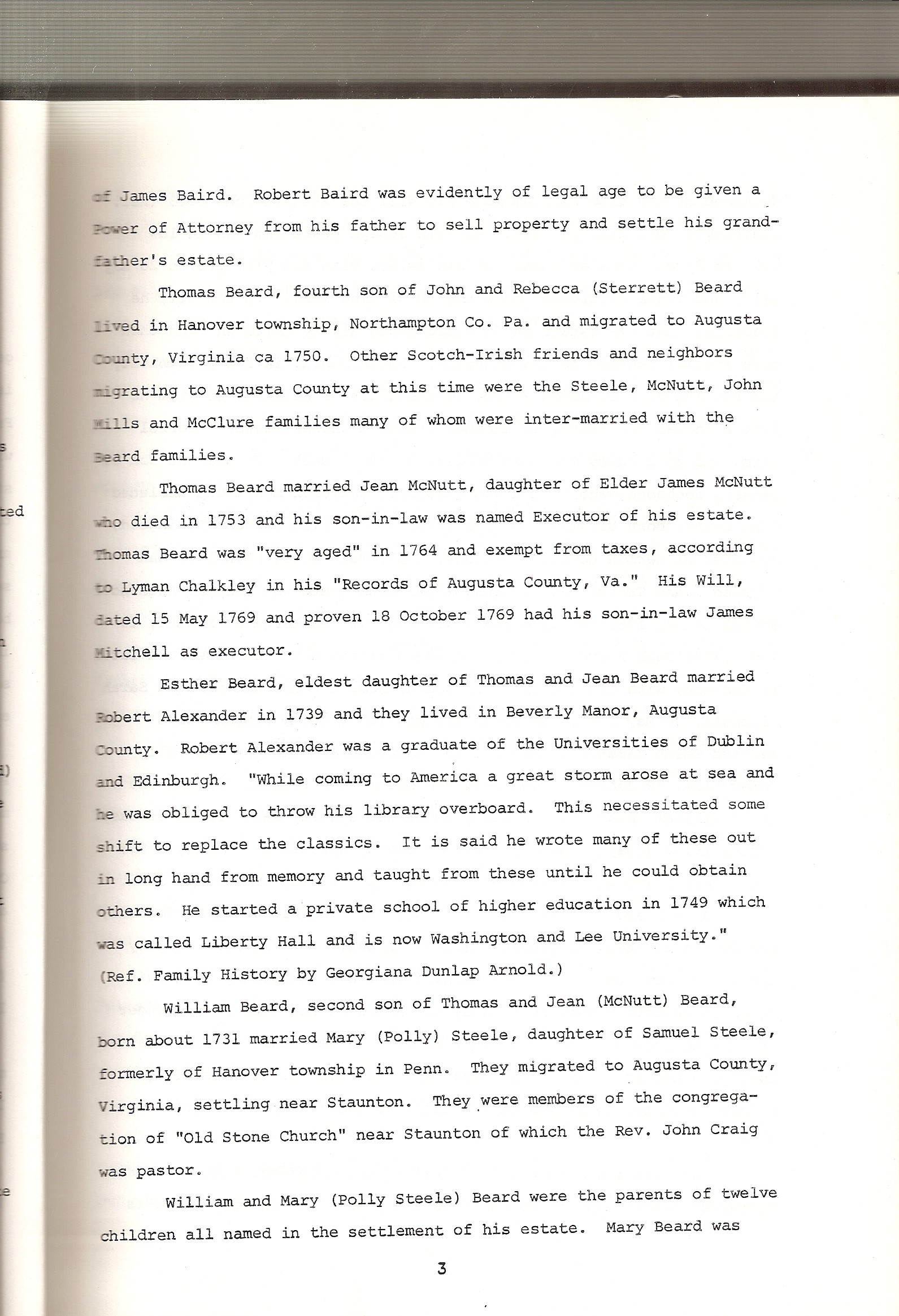 William Beard, second son of Thomas and Jean McNutt Beard, born about 1731 married Mary (Polly) Steele, daughter of Samuel Steele, formerly of Hanover township in Penn. They migrated to Augusta County, Virginia, settling near Staunton. They were members of the congregation of "Old Stone Church" near Staunton of which the Rev. John Craig was pastor.