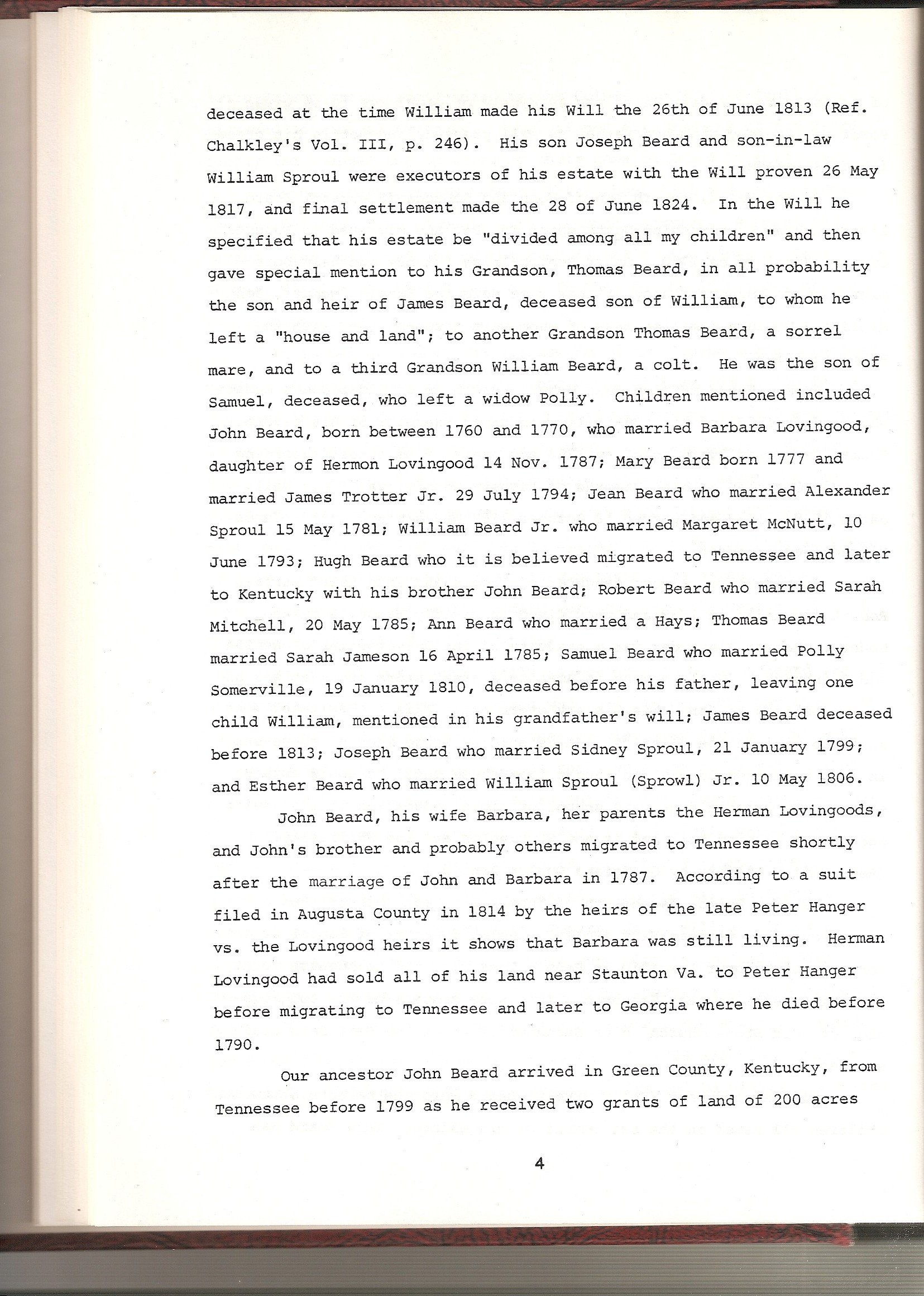 On May 15, 1819, a Power of Attorney was recorded at Burkesville, county seat of Cumberland County, Ky. by John Beard and his two sisters, Jean (Jane) Sproul, wife of Alexander Sproul, deceased, and Mary Trotter, wife of James Trotter Jr. appointing their brother William Beard Jr. of Washington County, Va. as their Attorney in settling the estate of their father [8], William Beard, whose will was proved in Augusta County, Va 26 May 117 and final settlement made June 28, 1924.