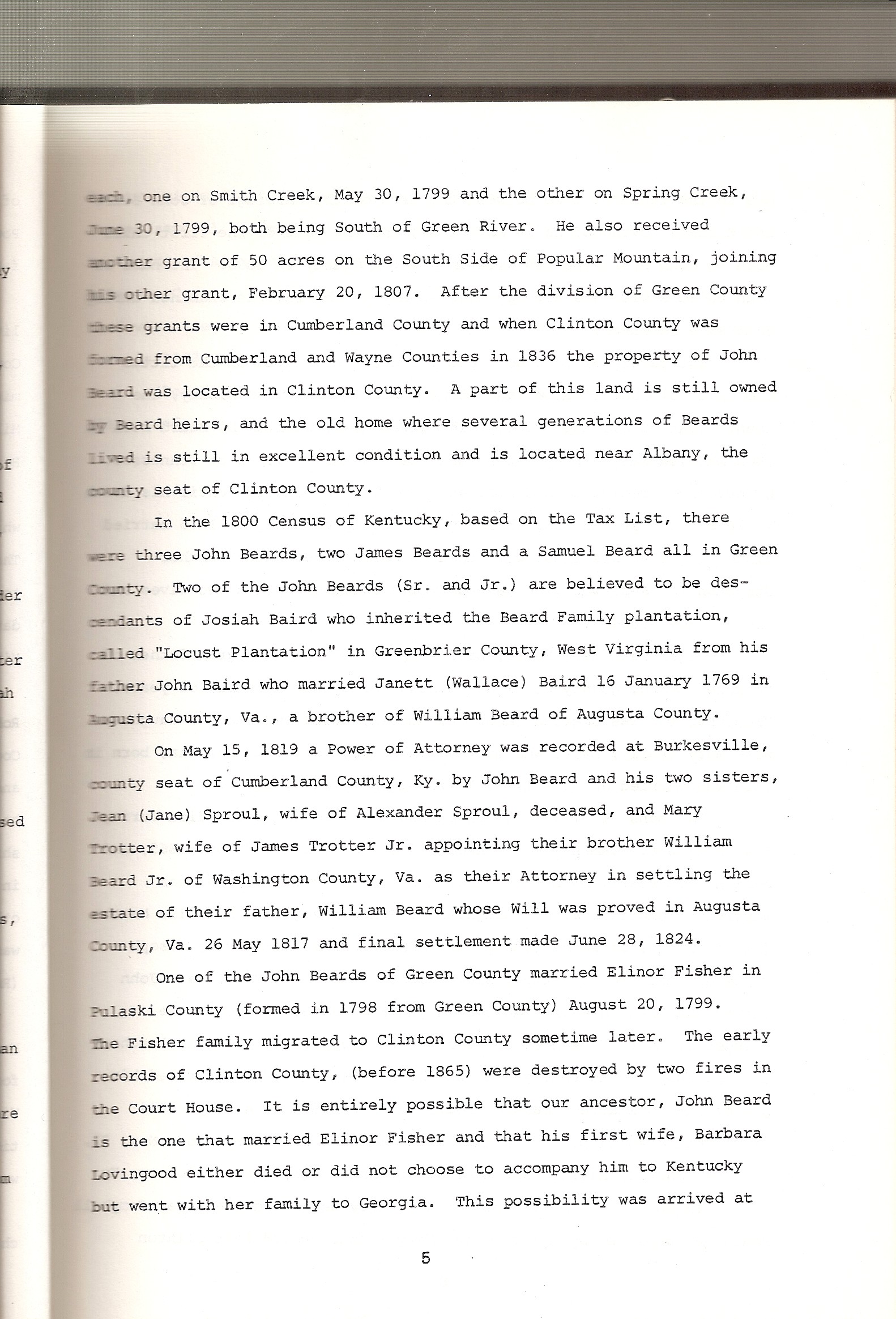 One of the Jonn Beards of Green County married Elinor Fisher in Pulaski county (formed in 1798 from Green County) August 20, 1799. The Fisher family migrated to Clinton County sometime later. The early records of Clinton County, (before 1865) were destroyed by two fires in the Court House. It is entirely possible that our ancestor, John Beard, is the one that married Elinor Fisher and that his first wife, Barbara Lovingood either died or did not choose to accompany him to Kentucky but went with her family to Georgia. This possibility was arrived at due to the lapse of time between the date of the marriage of John Beard and Barbara Lovingood 14 Nov 1877 and the date of the first child born to John Beard and his wife In Clinton County in 1803. The name of the John Beard's wife has not appeared in any of the records examined in the extensive research.