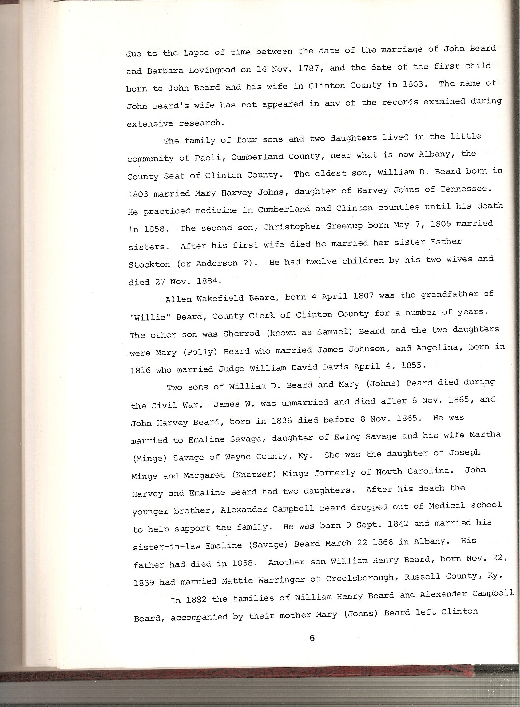 The family of four sons and two daughters lived in the little community of Paoli, Cumberland County, near what is now Albany, the county seat of Clinton County. The eldest son, William D. Beard born in 1803 married Mary Harvey Johns, daughter of Harvey Johns of Tennessee. He practiced medicine in Cumberland and Clinton counties until his death in 1858. The second son, Christopher Greenup born May 7, 18905 married sisters. After his first wife died he married her sister Esther Stockton (or Anderson ?). he had twelve children by his two wives and died 27 Nov 1884.