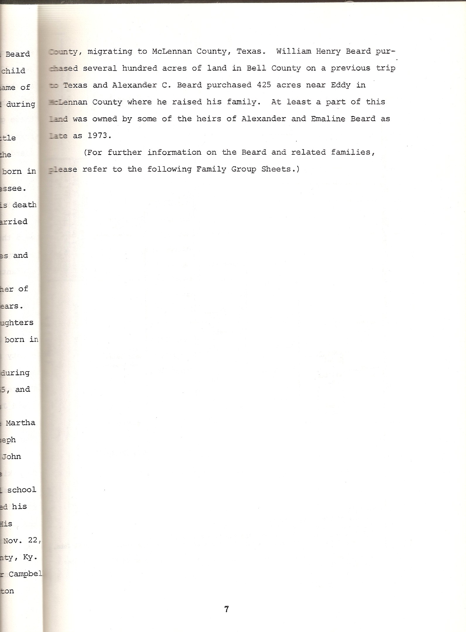In 1882 the families of William Henry Beard and Alexander Campbell Beard, accompanied by their mother Mary (Johns) Beard left Clinton County, migrating to McLennan County, TX. William Henry Beard purchased several hundred acres of land in Bell County on a previous trip to Texas and Alexander C. Beard purchased 425 acres near Eddy in McLennan County where he raised his family. At least a part of this land was owned by some of the heirs of Alexander and Emaline Beard as late as 1973.