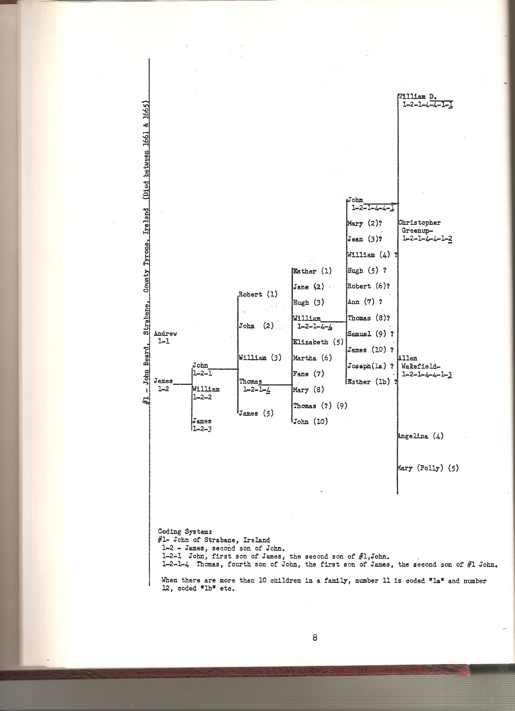 This book, and the accompanied "A Supplement to the history of the Beard-Bedichk-Craven" families dated 1981, was researched and compiled by Pauline Beard Cooney. It traces the ancestry of the Beards from Strabane, now Northern Ireland, to the migration of John Beard (Baird)/Rebecca Sterrett with their children Robert, John, Williams, James, Hannah and Thomas to Delaware, and Thomas's subsequent migration to Staunton, VA.
