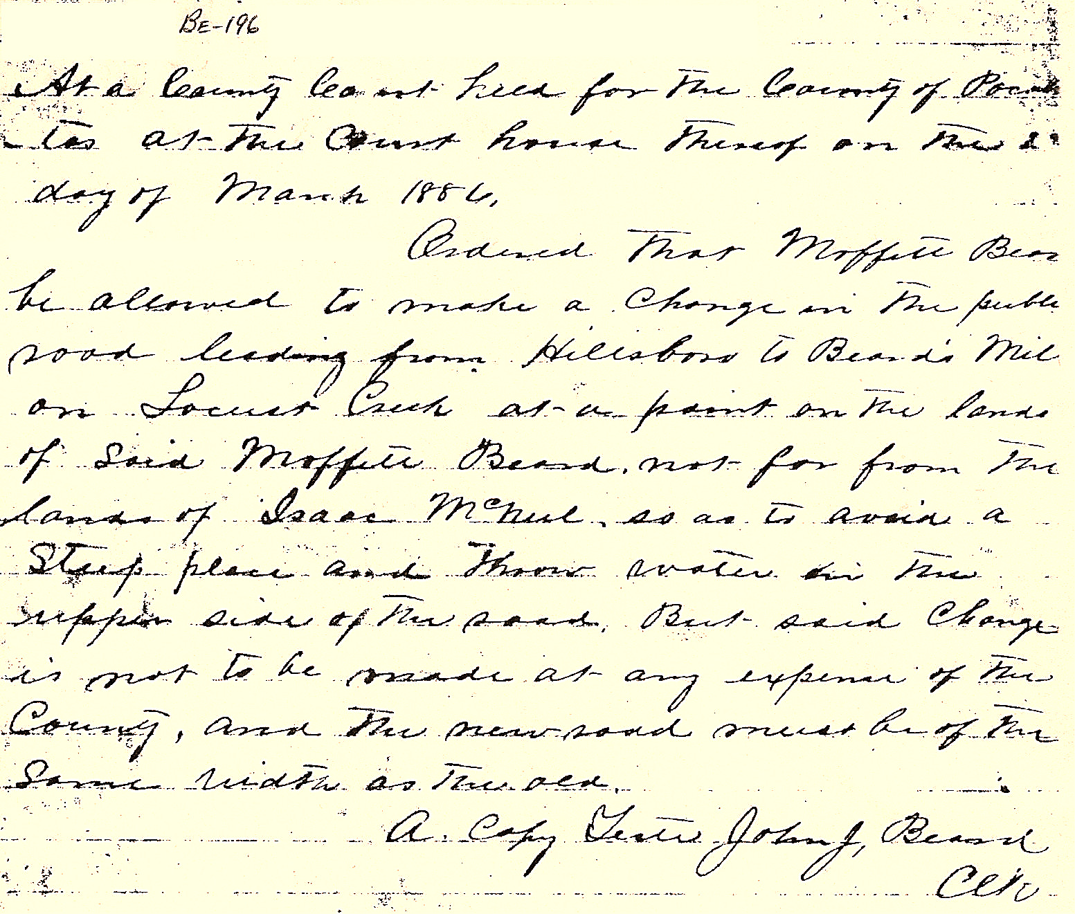 A record in 1886 shows that Moffet improved the road between Hillsboro and Beard's Mill "to avoid a steep section at no cost to the County of Pocahontas", and that Moffet Beard was responsible for "maintaining the width of the road". The county clerk at that time was John Jordan Beard, a cousin descended from John Beard through John's son Samuel.