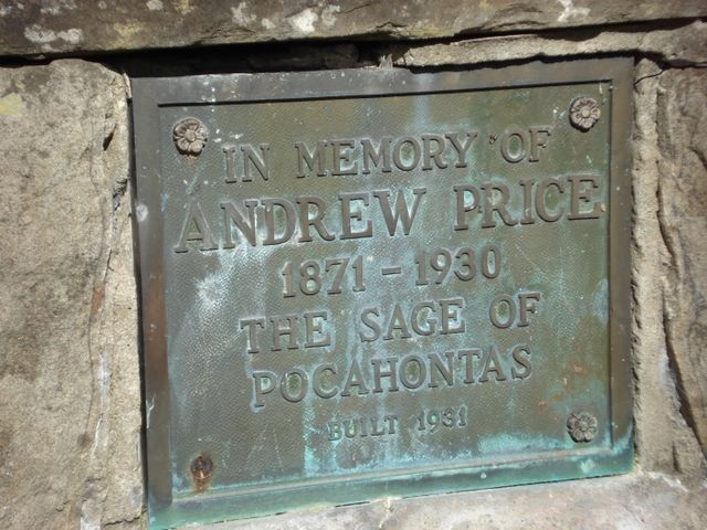 Andrew Price Memorial Photo's (taken in early 2003) contributed by volunteer Paul Greathouse. Erected in 1931 to the memory of Andrew Price - editor, author, lawyer, geologist, and president of the West Virginia Historical Society. DESCRIPTION: It is built of stones collected by Mr. Price from various locations in West Virginia. It's base is 10 feet square, the second tier is five feet square, and the top tier is three feet square. Within the document is buried his hammer and a sealed small bottle containing historical information.* LOCATION: Per the book History of Pocahontas County, West Virginia 1981, "The memorial is located one mile north of Marlinton on the wooded hillside beyond the Stony Creek Bridge, past the State Road Garage. " Per volunteer Paul Greathouse, this memorial is located on the Back Mountain Road. After you turn on this road, drive just a short distance until you cross a small bridge. After you cross this bridge, on the right of the road there is an access road to a field. Just a short distance farther there is a wide place on the right of the road. When you are parked at this wide place by the road, you can look to the left of the road up on the hill and see this monument. With leaves on it, it may be difficult to see. It is not far up from the road. |