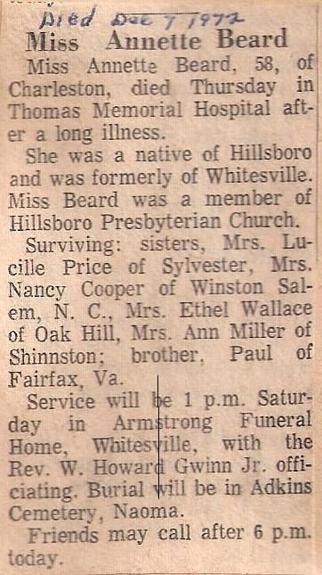 | (Died Dec 7, 1972) Miss Annette Beard - Miss Annette Beard, 58, of Charleston, died Thursday in Thomas Memorial Hospital after a long illness. She was a native of Hillsboro and formerly of Whitesville. Miss Beard was a member of the Hillsboro Presbyterian Church. Surviving : sisters, Mrs. Lucille Price of Sylvester, Mrs. Nancy Cooper of Winston Salem, N.C., Mrs. Ann Miller of Shinnston; brother, Paul of Fairfax, VA. Service will be at 1 p.m. with the Rev. W. Howard Gwinn Jr. officiating. Burial will be in Adkins Cemetery, Naoma. Friends may call after 6 p.m. today. |
