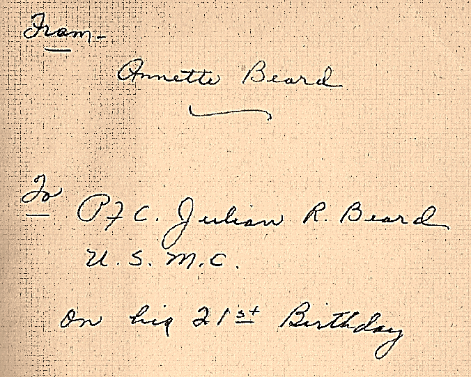 ![]() Inscription in gift to Julian Ralph Beard, June 1944. Gift was book entitled "The World We Live In" by Louis Bromfield, published by Harper & Bros 1944. The book was passed along to Shawn Robbins (son of Sheryl Annette Beard Robbins) on the occasion of his 21st birthday, in November of 2006. |