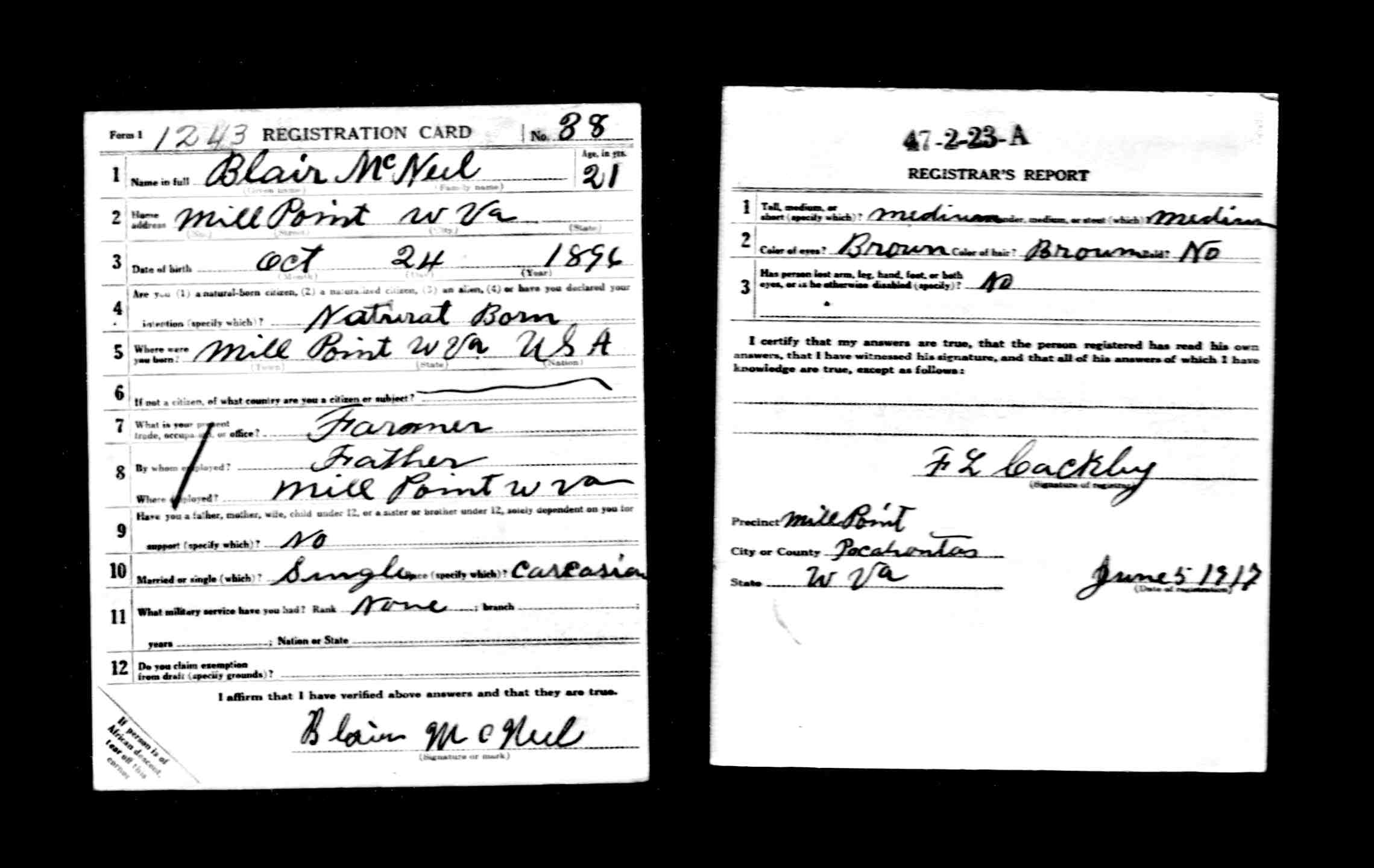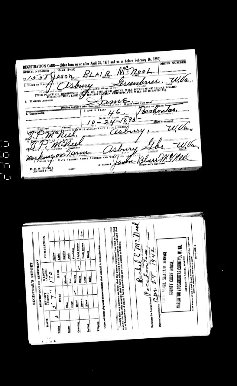 Age 46 Jason Blair McNeel - WWI Draft Card - |