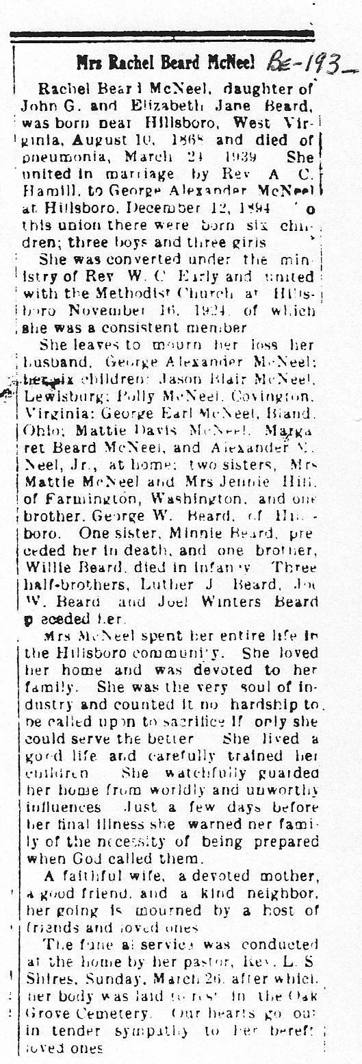 | Obituary : Rachael Beard McNeel, daughter of John G. and Elizabeth Jane Beard, was born near Hillsboro, West Virginia, August 10, 1868 and died of pneumonia, March 24, 1939. She united in marriage by Rev. A. C. Hamill to George Alexander McNeel at Hillsboro, December 12, 1894, of this union there were born six children; three boys and three girls. She was converted under the ministry of Rev. W. C. Early and united with the Methodist Church at Hillsboro November 16, 1924 of which she was a consistent member. She leaves to mourn her loss her husband, George Alexander McNeel, her six children, Jason Blair McNeel, Lewisburg, Polly McNeel, Covington, Virginia; George Earl McNeel,, Biand, Ohio; Mattie Davis McNeel; Margaret Beard McNeel and Alexander McNeel, Jr. at home; two sisters : Mrs. Mattie McNeel and Mrs. Jennie Hill of Farmington, Washington, and the brother , George W. Beard of Hillsboro. One sister, Minnie Beard, preceded her in death, and one brother, Willie Beard, died in infancy. Three half-brothers, Luther J. beard, Jim W. Beard and Joel Winters Beard preceded her. Mrs. McNeel spent her entire life to the Hillsboro community. She loved her home and was devoted to her family. She was the very soul of industry and counted it no hardship to be called upon to sacrifice if only she could serve the better. She lived a good life and carefully trained her children. She watchfully guarded her home from worldly and unworthy influences. Just a few days before her final illness she warned her family of the necessity of being prepared when God called them. A faithful wife, a devoted mother, a good friend, and a kind neighbor, her going is mourned by a host of friends and loved ones. The funeral service was conducted at the home by her pastor. Rev. L.S. Shires, Sunday March 26 after which her body was laid to reset in the Oak Grove Cemetery. Our hearts go out in tender sympathy to her bereaved loved ones. |