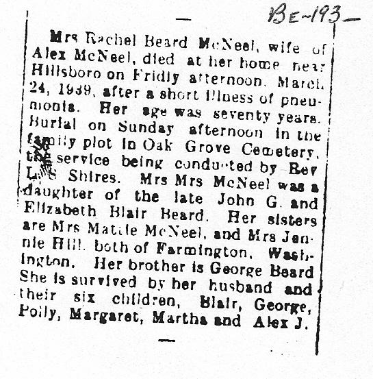 | Obituary : Mrs. Rachel Beard McNeel, wife of Alex McNeel died at her home near Hillsboro on Friday afternoon, March 24, 1939, after a short illness of pneumonia. her age was seventy years. Burial on Sunday afternoon in the family plot in Oak Grove Cemetery, the service being conducted by Rev. L.S. Shires. Mrs. McNeel was a a daughter of the late John G. and Elizabeth Blair Beard. her sisters are Mrs. Mattie McNeel and Mrs. Fannie Hill, both of Farmington, Washington. her brother is George Beard. She is survived by her husband and their six children, Blair, George, Polly, Margaret, Martha, and Alex J. |