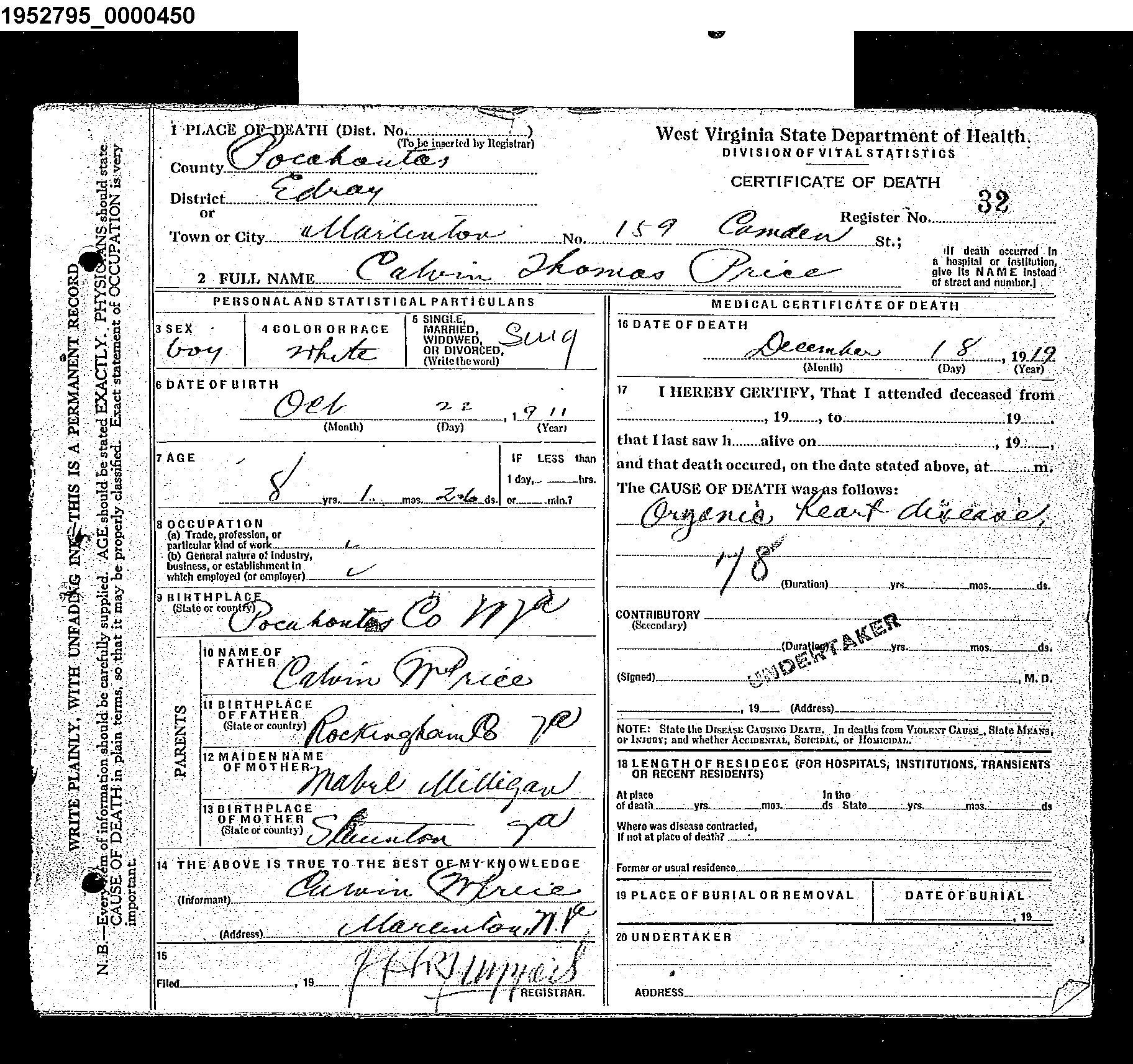 | Death Record - Calvin Thomas Price 18 Dec 1919 - 8 Yrs Old |