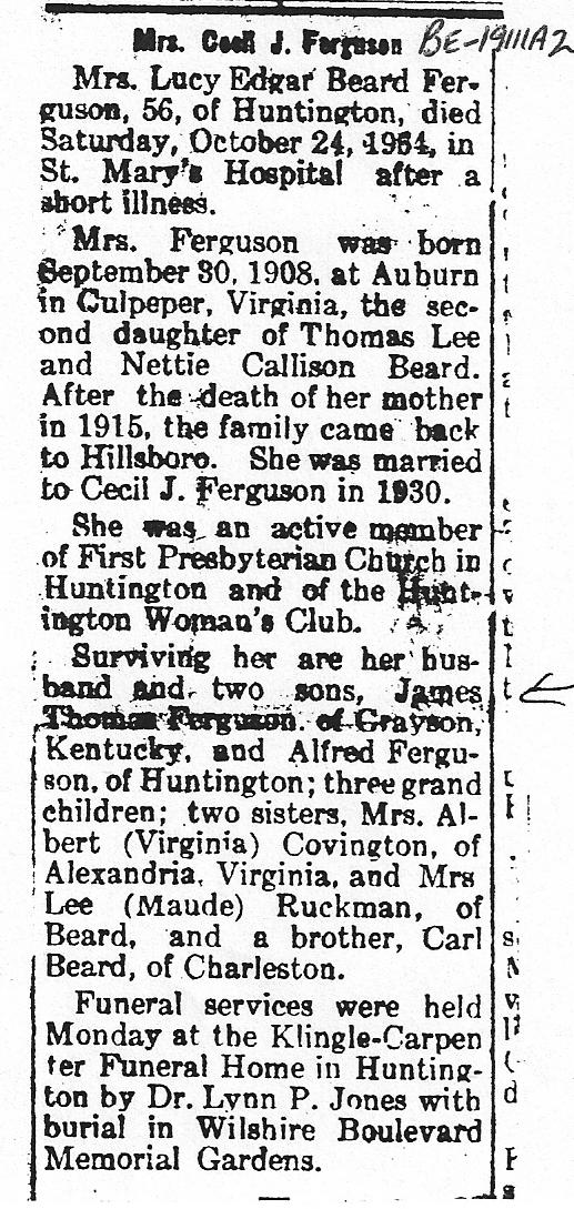 Mrs. Lucy Edgar Beard Ferguson, 56, of Huntington, died Saturday, October