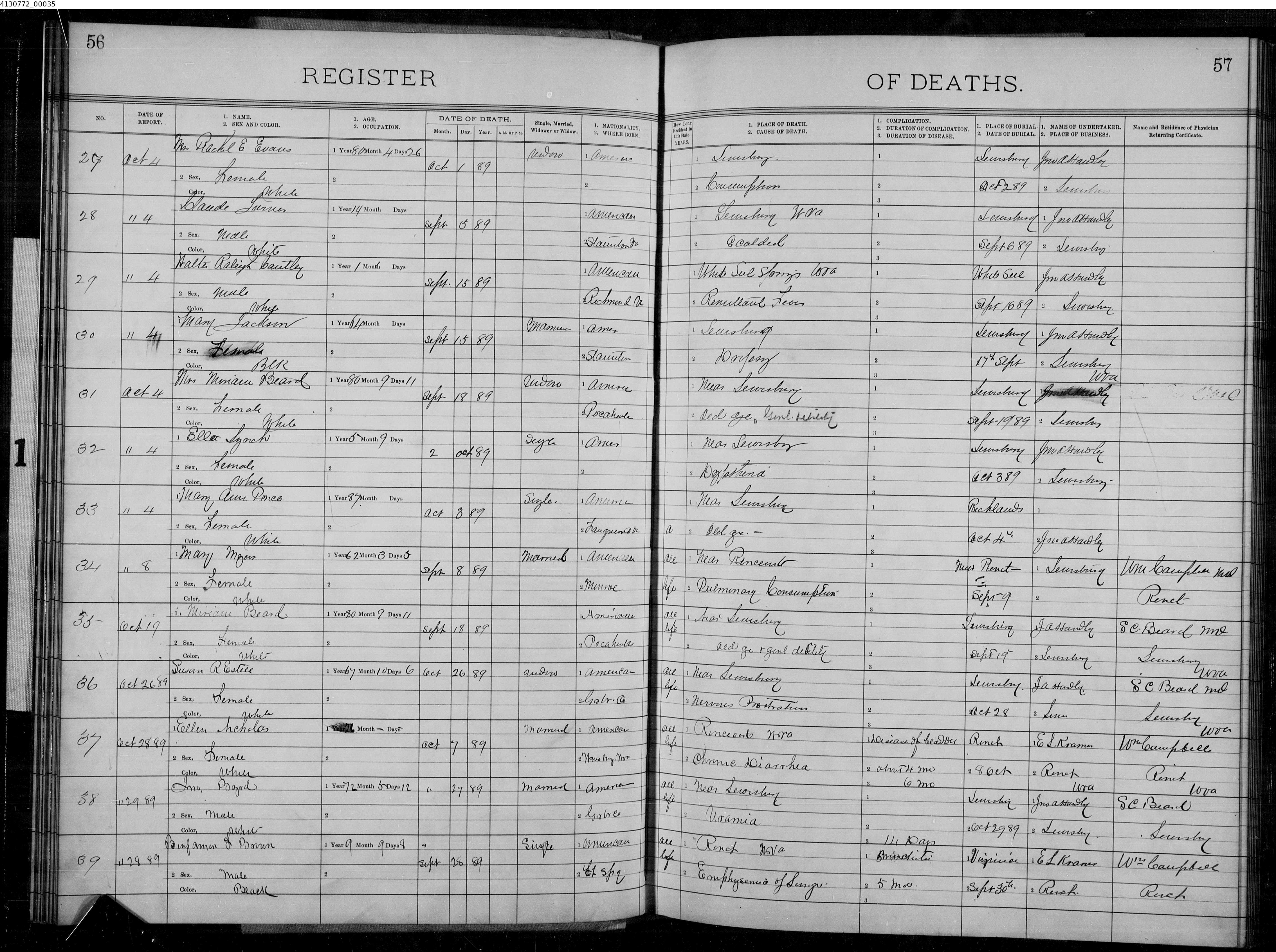 http://www.wvculture.org/vrr/va_view.aspx?Id=2896799&Type=Death Miriam Beard, F, Death 18 Sep 1889 Near Lewisburg, Greenbrier, WV, Buried 19 Sep 1889. Born Pocahontas, WV, Widowed. Age 80 Year 9 Month 11 Days. d Old Age |