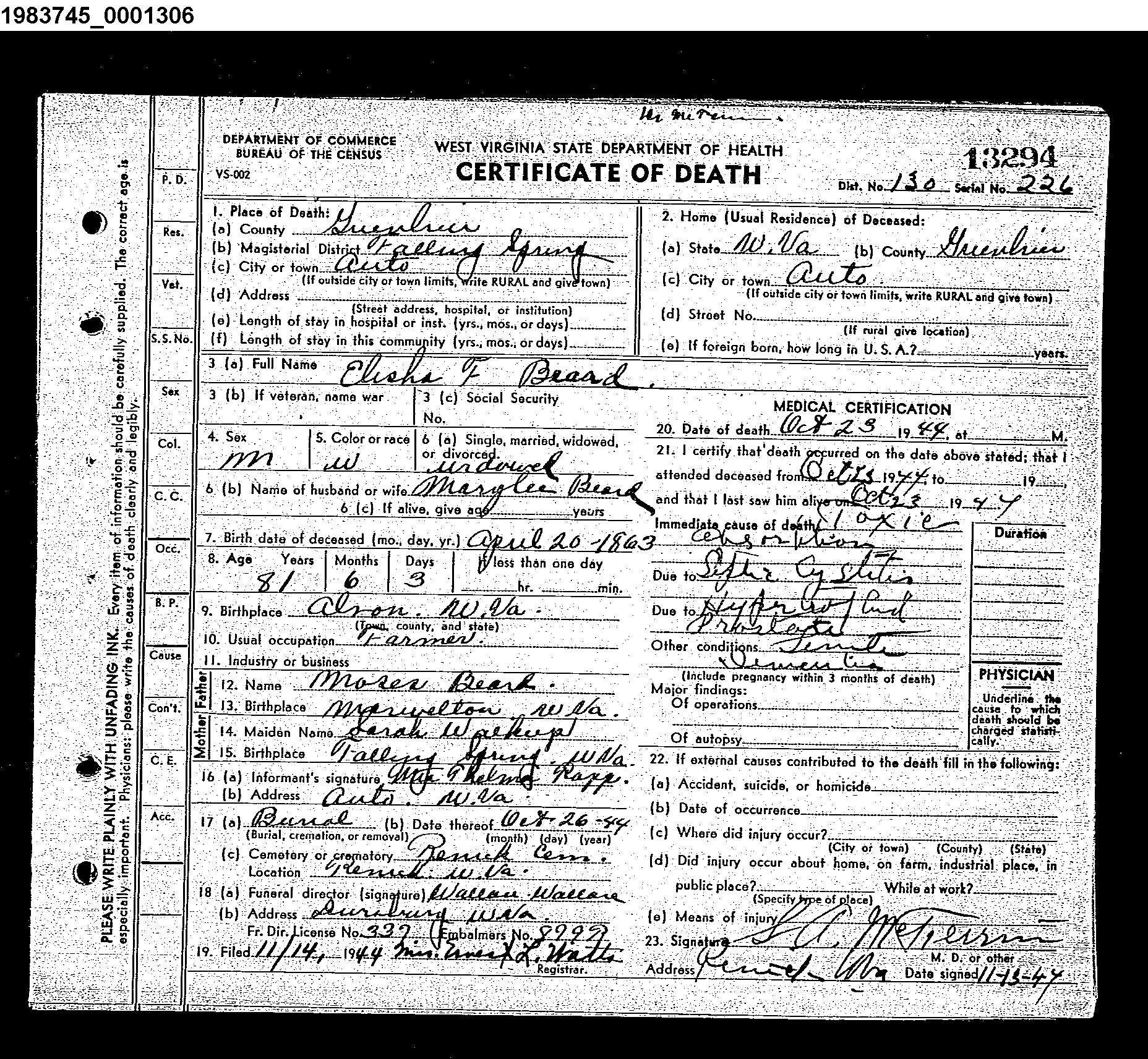 http://www.wvculture.org/vrr/va_view.aspx?Id=2893940&Type=Death Vivian Beard, F, d 30 May 1902, Greenbrier Co., WV; Age 6y 1m, S, Mother Mary Beard, Father, E.F. Beard, d Heart Disease |