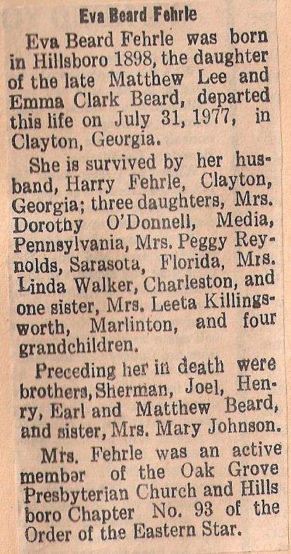 survived by her husband Harry Fehrle, Clayton, Georgia; three