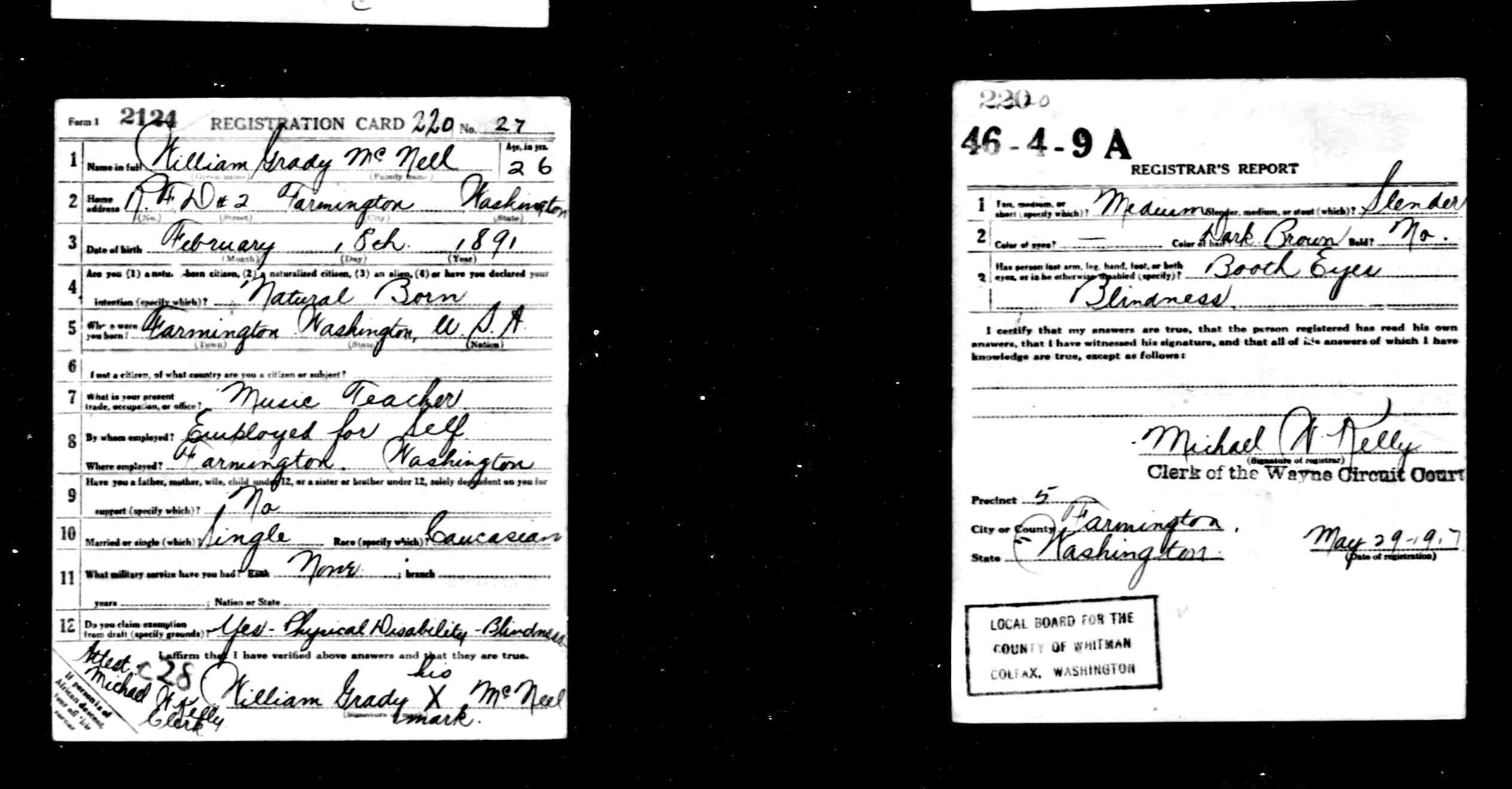Draft Card - William Grady McNeel (note : Blindness, both eyes)