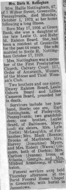 Sterle; one son, Earl Nottingham of Finleyville, Pennsylvania; Layke Beard