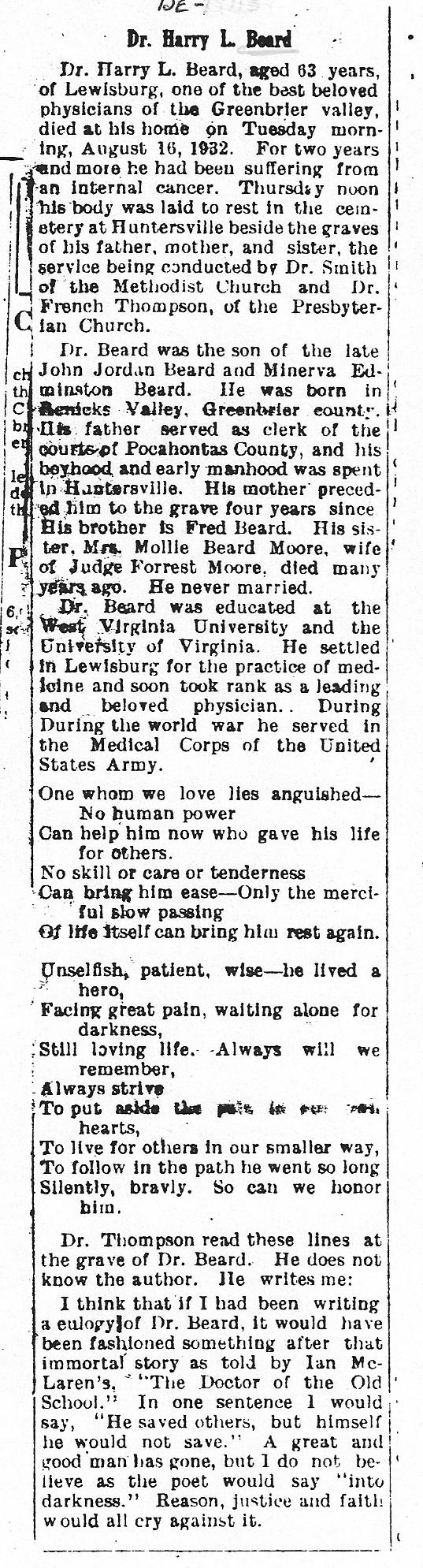 | Obituary : Dr. Harry L. Beard, aged 63 years, of Lewisburg, one of the best beloved physicians of the Greenbrier valley, died at his home on Tuesday morning, August 16, 1932. For two years and more he had been suffering from an internal cancer. Thursday morning his body was laid to rest besides the graves of his father, mother, and sister, the service being conducted by Dr. Smith of the Methodist Church and Dr. French Thompson of the Presbyterian Church. Dr. Beard was the son of the late John Jordan Beard and Minerva Edminston Beard. he was born at Renicks Valley, Greenbrier County. His father served as clerk of the courts of Pocahontas County and his boyhood and early manhood was spent in Huntersville. His mother preceded him to the grave four years since. His brother is Fred Beard. his sister, Mrs. Mollie Beard Moore, wife of Judge Forest Moore, died many years ago. he never married. Dr. Beard was educated at the West Virginia University and the University of Virginia. he settled in Lewisburg for the practice of medicine and soon took rank as a leading and beloved physician. During the World War he served the Medical Corps of the United States Army. One whom we love lies anguished -- no human power Can help him now who gave his life for others. No skill or care or tenderness Can bring him ease -- Only the merciful slow passing Of life itself can bring him reset again. Unselfish, patient, wise -- he lived a hero. Facing great pain, waiting alone for darkness. Still loving life, Always will we remember. Always strive. To put aside the ... in our hearts. To live for others in our smaller way. To follow in the path he went so long. Silently, bravely, So we can honor him. Dr. Thompson read these lines at the grave of Dr. Beard. he does not know the author. he writes me. I think that if I had been writing a eulogy of Dr. Beard, it would have been fashioned something after that immortal story as told by Ian McLaren's "The Doctor of the Old School." In one sentence I would say "He saved others, but himself he would not save." A great and good man has gone, but I do not believe as the poet would say "into darkness" Reason, justice and faith would all cry against it. |