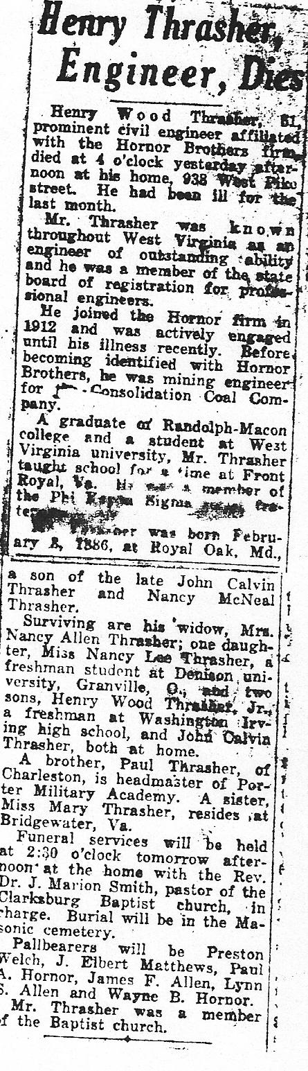 | Obituary : Henry Thrasher, Engineer, dies. Henry Wood Thrasher, 51, prominent civil engineer affiliated with the Hornor Brothers firm died at 4 o'clock yesterday afternoon at his home, 838 West Pike Street. He had been ill for the last month. Mr. Thrasher was known throughout West Virginia as an engineer of outstanding ability and was a member of the state board of registration for professional engineers. He joined the Hornor firm in 1912 and was actively engaged until his illness recently. Before becoming identified with the Hornor brothers, he was mining engineering for the Consolidation Coal Company. A graduate of Randolph-Macon college and a student at West Virginia university, Mr. Thrasher taught school for a time at Front Royal, VA. he was a member of the Phi Kappa Sigma fraternity. Mr. Thrasher was born February 8, 1886, at Royal Oak, Md. a son of the late John Calvin Thrasher and Nancy McNeel Thrasher. Surviving are his window, Mrs. Nancy Allen Thrasher, one daughter, Miss Nancy Lee Thrasher, a freshman student at Denison university, Granville, and two sons, Henry Wood Thrasher Jr., a freshman at Washington Irving High School and John Calvin Thrasher, both at home. A brother, Paul Thrasher, of Charleston, is headmaster of Porter Military Academy. A sister, Miss Mary Thrasher, resides at Bridgewater, VA. Funeral services will be held at the 2:30 O'clock tomorrow afternoon at the home with the Rev. Dr. J. Marion Smith, pastor of the Clarksburg Baptist Church, in charge. Burial will be in Masonic Cemetery. Pallbearers will be Preston Welch, J. Elbert Matthews, Paul A. Hornor, James F. Allen, Lynn S. Allen and Wayne B. Hornor. Mr.. Thrasher was a member of the Baptist Church. |