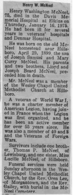 | Obituary - Henry Washington McNeel, 76, died in the Davis Memorial Hospital at Elkins on Thursday, January 16, 1975. He had been ill for several years in veteran's hospitals and Denmar Hospital. he was born on the old McNeel homestead near Hillsboro, April 29, 1899, the son of Joseph Samuel and Mary Curry McNeel. His parents and two brothers, Lloyd and Joseph Beard McNeel, preceded him in death. Mr. McNeel was a member of the Wesley Chapel United Methodist Church at Hillsboro. A veteran of World War I, he was a charter member of the American Legion, having joined in France when the Legion was first organized, and he has been an active member for over 55 years since. He was also a member of 40 and 8 and the Veterans of Foreign Wars. Survivors include one brother, Thomas P. McNeel of Lewisburg, and one sister, Miss Lucille McNeel of Hillsboro. Funeral services were held Sunday afternoon in the Wesley Chapel United Methodist Church by the Rev. Oren Lee of Morgantown and the Rev Bailey, with burial in the McNeel Cemetery. |