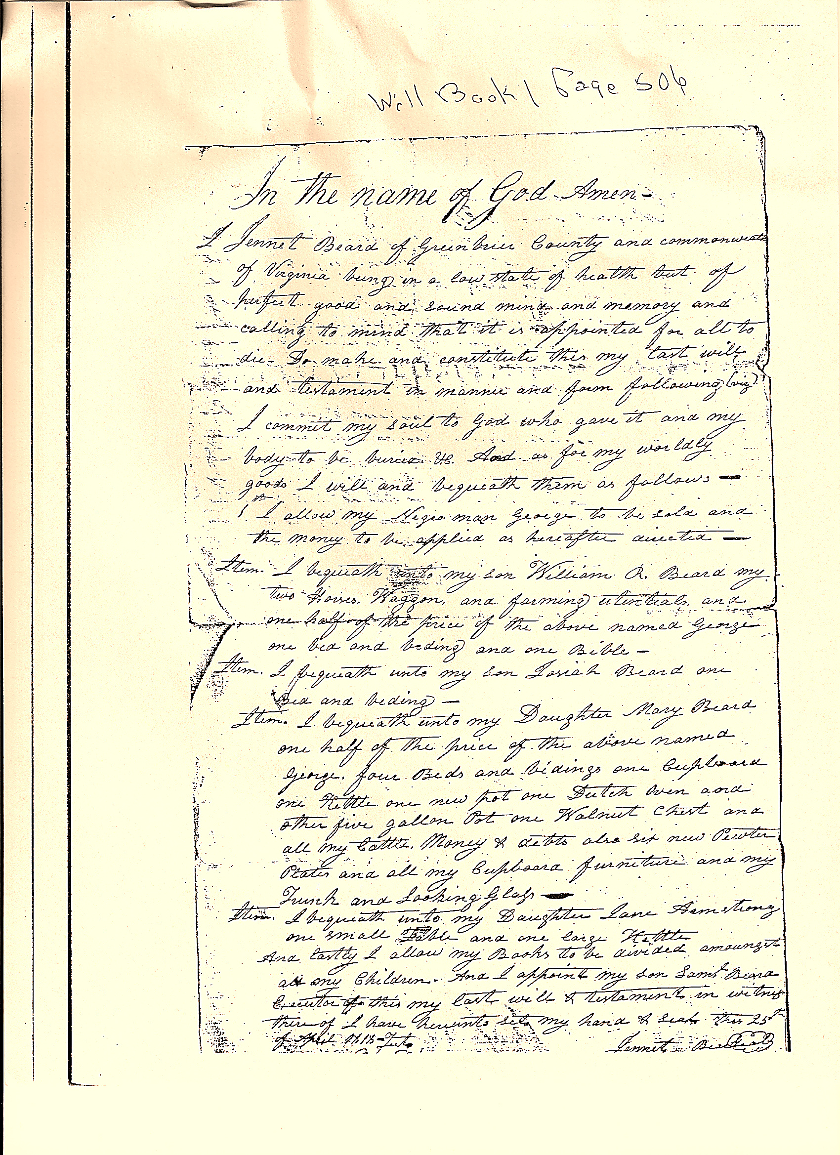 Last Will and Testament Janett Wallace Beard Original Copy Will Book Page 506 - 25 April 1818 In the name of God, Amen - I Jennett Beard of Greenbrier County and commonwealth of Virginia being in a low state of health but of heartfelt good and sound mind and memory and calling to mind that is is appointed for all to die, Do make and constitute this my last will and testament in manner and form following (viz). I commit my soul to God who gave it and my body to be buried ve. And as for my worldly goods, I will and bequeath them as follows - 1. I allow my Negro man George to be sold and the money to be applied as here after directed -- Item I bequeath unto my son William R. Beard my two Horses, Waggon, and farming utensils, and one half of the price of the above named George one bed and bedding and one Bible - Item I bequeath unto my son Josiah Beard one Bed and bedding - Item I bequeath unto my Daughter Mary Beard one half of the price of the above named George, four Beds and Beddings one Cupboard one Kettle one new pot Dutch Oven and other five gallon Pots one Walnut Chest and all of my Cattle, Money and Debts also six new Pewter Plate and all my Cupboard furniture and my Trunk and Looking Glass -- Item I Bequeath unto my Daughter Jane Armstrong one small table and one large Kettle And lastly I allow my Books to be divided amongst all my Children. And I appoint my son Samuel Beard Executor of this my last will and testament in writing there of I have here unto set my hand and seal Thurs 25th of April 1818. |