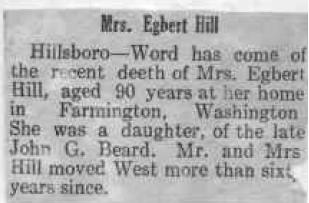 | Obituary - Mrs. Egbert Hill - Hillsboro - Word has come of the recent death of Mrs. Egbert Hill, aged 90 years at her home in Farmington, Washington. She was a daughter of the late John G. Beard. Mr. and Mrs. Hill moved West more than sixty years since. |