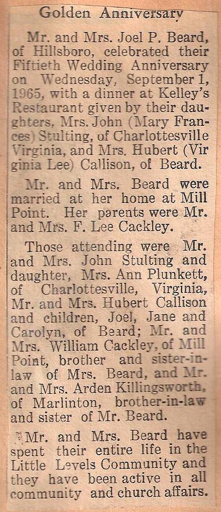 Lee) Callison, of Beard. Mr. and Mrs. Beard were married at her home in Mill Point. Her parents were Mr. and Mrs. F. Lee Cackley. Those attending were. Mr. and Mrs. John Stulting and daughter Mrs. Ann Plunkett, of Charlottesville, Virginia. Mr. and Mrs. Hubert Callison and children. Joel, Jane, and Carolyn of Beard; Mr. and Mrs. William Cackley of Mill Point, brother and sister in law of Mrs. Beard, and Mr. and Mrs. Arden Killingsworth, of Marlinton, brother-in-law and sister of Mr. Beard. Mr. and Mrs. Beard have spent their entire lives in the Little Levels Community and they have been active in all community and church affairs. |