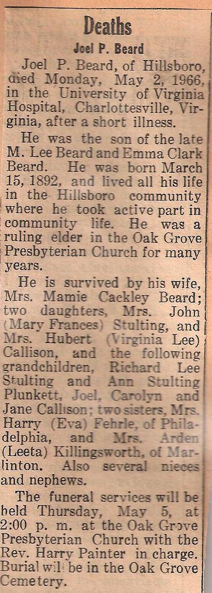 Joel P. Beard of Hillsboro died Monday May 2, 1966 in