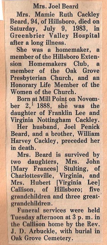| Mrs. Joel Beard - Mrs. Mamie Ruth Cackley Beard, 94 of Hillsboro, died on Saturday, July 9, 1983 in Greenbrier Valley Hospital after a long illness. She was a homemaker, a member of the Hillsboro Extension Homemakers Club, a member of the Oak Grove Presbyterian Church, and an Honorary Life Member of the Women of the Church. Born at Mill Point on November 2, 1888, she was the daughter of Franklin Lee and Virginia Nottingham Cackley. Her husband, Joel Penick Beard and a brother, William Havey Cackley, preceded her in death. Mrs. Beard is survived by two daughters, Mrs. John [Mary Frances} Stulting, of Charlottesville, Virginia, and Mrs. Hubert [Virginia Lee] Callison, of Hillsboro; five grandchildren and three great-grandchildren. Funeral services were held Tuesday afternoon at 3 PM in the Callison home by the Rev. J. D. Arbuckle, with burial in the Oak Grove Cemetery. |