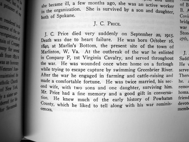 J. C. Price - J. C. Price died very suddenly on September 20, 1915. Death was due to heart failure. He was born October 16, 1840, at Marlin's Bottom, the present site of the town of Marlinton, WV. At the outbreak of the war he enlisted in Company F, 1st Virginia Calvary, and served throughout the war. He was wounded once when home on a furlough while trying to escape capture by swimming Greenbrier River. After the war he engaged in farming and cattle raising and made a comfortable fortune. He was twice married, his second wife, with two sons and one daugther surviving him. Mr. Price had a fine memory and a good gift in conversation. he knew much of the early history of Powatan County, which he liked to tell along with his war rememberences. |