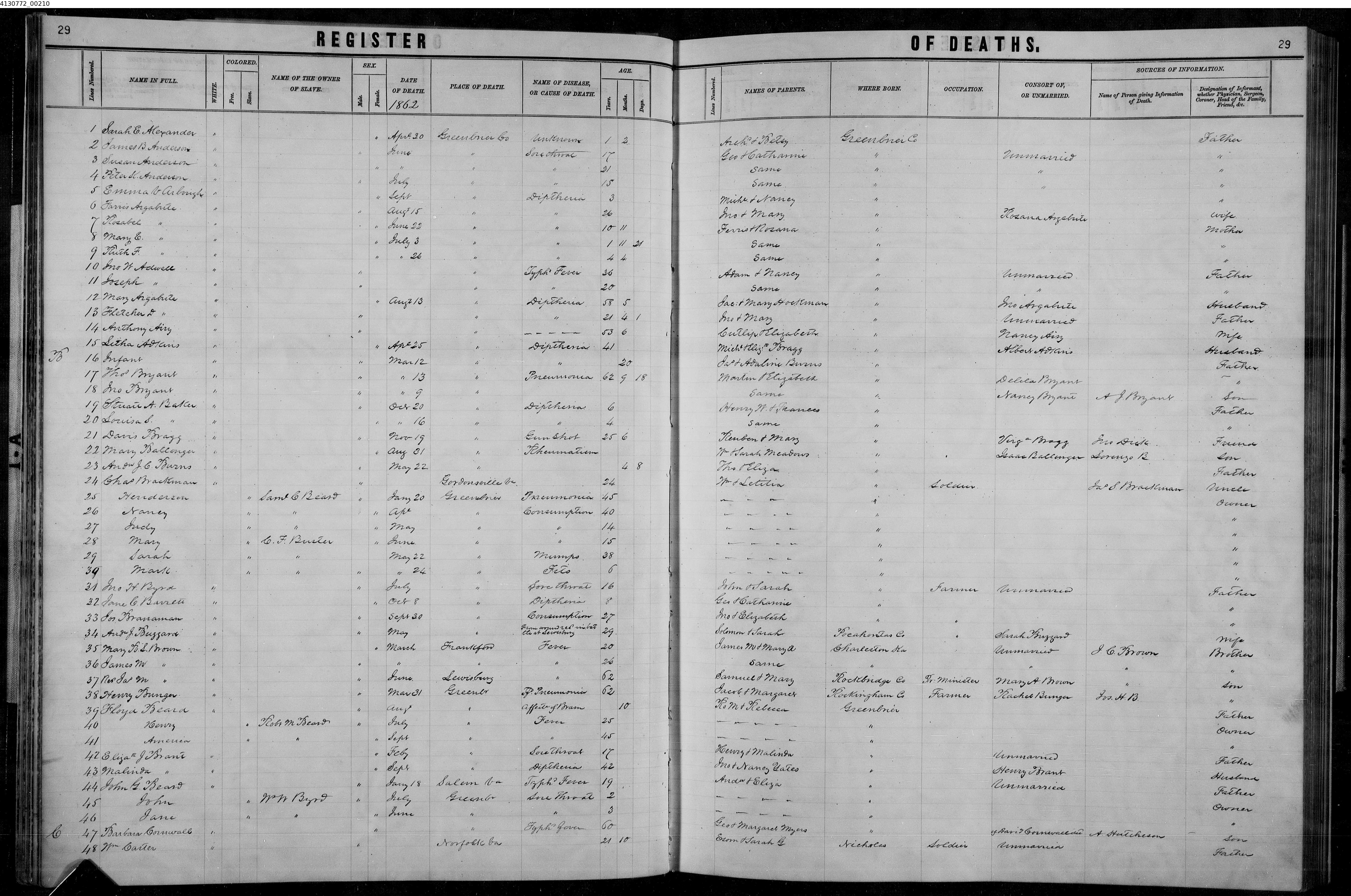 http://www.wvculture.org/vrr/va_view.aspx?Id=2900656&Type=Death John G. Beard, Male, d 18 Jan 1862, Salem, VA, 19y. Birth Greenbrier County, WV, Single, Mother Eliza, Father Andw. Typhoid Fever. |