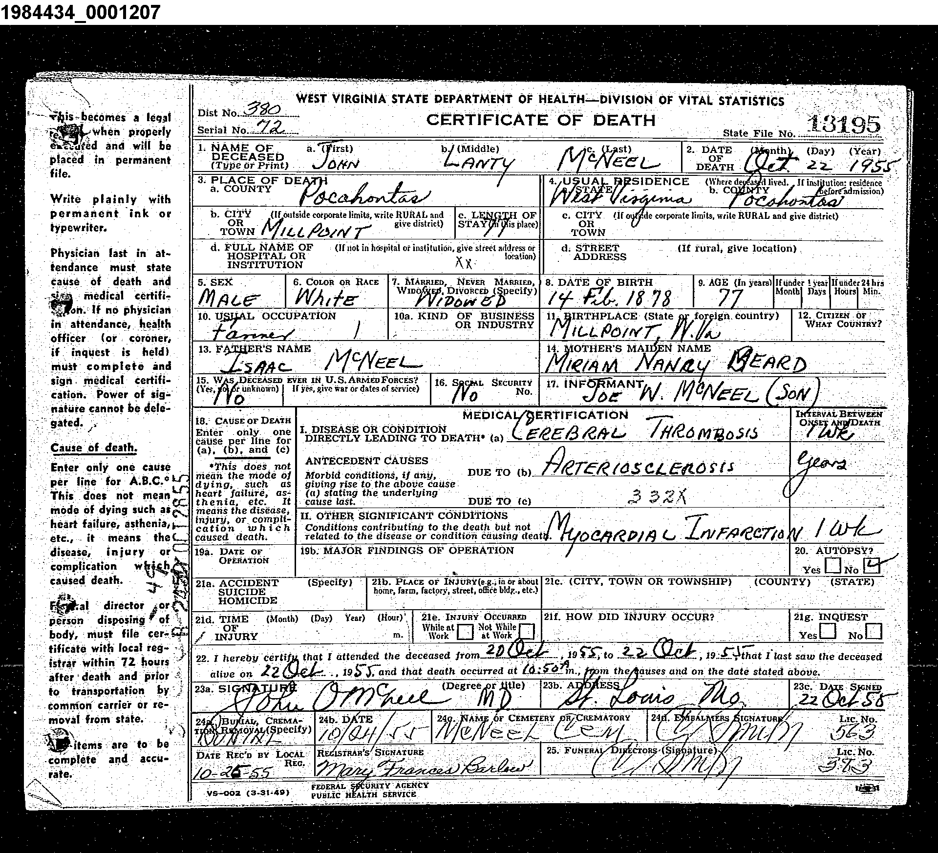 | Death Record : John Lanty McNeel 1955 |