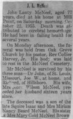 | Obituary - John Lanty McNeel, aged 77 years, died at his home at Mill Point on Saturday Morning, October 22, 1955. Death was attributed to cerebral hemorrhage. He had been in failing health for several years. On Monday afternoon, the funeral was held from Oak Grove Church by his pastor, Rev. Collier Harvey, Jr. His body was laid to rest in the McNeel Cemetery. Mr. McNeel is survived by his three sons - Dr. John of St. Louis, Missouri, Joe W. at home and Richard of Hillsboro. His wife, Mrs. Nora Wilson McNeel, preceded her husband sixteen years since. The deceased was a son of the late Squire Isaac and Nancy Beard McNeel. His sister is Mrs. Mary Gold McNeel Brown. |