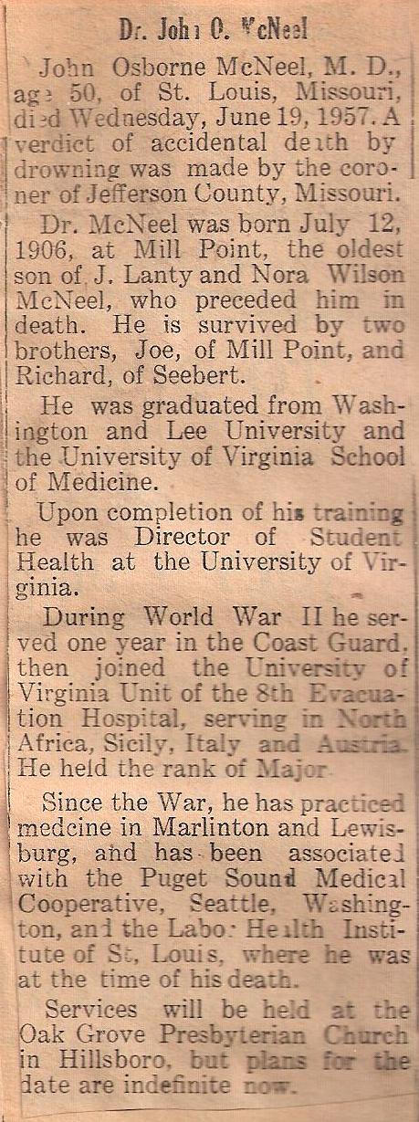 | Dr. John O. McNeel - John Osborne McNeel, M. D., age 50 of St. Louis Missouri died Wednesday, June 19, 1957, A verdict of accidental death by drowning was made in the coroner of Jefferson County, Missouri. Dr. McNeel was born July 12, 1906 at Mill point, the oldest son of J. Lanty and Nora Wilson McNeel, who preceded him in death. He is survived by two brothers, Joe of Mill Point and Richard of Seebert. He was graduated from Washington and Lee University and the University of Virginia School of Medicine. Upon completion of his training he was Director of Student Health at the University of Virginia. During World War II he served one year in the Coast Guard, then joined the University of Virginia Unit of the 8th Evacuation Hospital, serving in North Africa, Sicily, Italy, and Austria. He held the rank of Major. Since the War, he has practiced medicine in Marlinton and Lewisburg and has been associated with the Puget Sound Medical Cooperative, Seattle, Washington and the Labor Health Institute of St. Louis, where he was at the time of his death. Services will be held at the Oak Grove Presbyterian Church in Hillsboro, but plans for the date are indefinite now. |