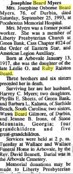 | Obituary - Mrs. Josephine Osborne Beard Myers, 76, of Durbin, died Saturday, September 25, 1993, at Pocahontas Memorial Hospital. Mrs. Myers was a former postal worker. She was a member of the Liberty Presbyterian Church at Green Bank, Cass Chapter #124 of the Order of the Eastern Star, and American Legion Auxiliary. Born at Arbovole January 13, 1917, she was the daughter of the late Leslie O. and Ruby Ralston Beard. Three brothers and six sisters preceded her in death. Surviving are her husband, Harvey C. Myers; two daughters Phyllis E. Sheets of Greenbank, and Barbara L. Kalama of Surfside Beach, South Carolina; two sisters; Wawa Beard Gilmore of Durbin and Jeanne B. Irons of Stone Mountain, Georgia; four grandchildren and five great-grandchildren. Services were held at 2 p.m. Tuesday at Wallace and Wallace Funeral Home in Arbovale by the Rev. David Bennett. Burial was in the Arbovale Cemetery. Memorial donations may be made to Liberty Presbyterian Church, Green Bank. |
