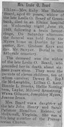| Obituary - Mrs. Leslie O. Beard - Elkins - Mrs. Ruby Mae Ralston Beard, aged 60 years, widow of the late Leslie O. Beard of Greenbank, died in an Elkins hospital on Wednesday night June 29, 1949, following a brain hemorrhage. On Saturday afternoon the funeral was held from the Myers home in Durbin by her pastor, Rev Graham Keyand Rev. Mr. Sawyer. Burial in the Arbovale Cemetery. The deceased was the widow of the late Leslie O. Beard, who preceded her in death about sixteen years since. They were the parents of eleven children, ten of whom survive; Dewey R., Bertie McLaughlin, Lillian C. Kerr, Bonnie L. Brooks, Hallie Nottingham, Layke, Mildred Armstrong, Wawa Gilmore, Josephine Myers, Jeanne Irons. Mrs. Beard was the daughter of the late John Henry and Sarah Patience Hamilton Ralston, of McDowell, Virginia. She was a life long member of the Presbyterian Church. |