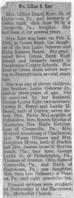 - Mrs. Lillian Beard Kerr, 55, of Hartstown, Pa. and formerly of Green Bank,