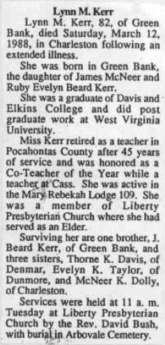 | Obituary - Lynn M. Kerr - 82 of Green Bank, died Saturday, March 12, 1988 in Charleston following an extended illness. She was born in Green Bank the daughter of James McNeer and Ruby Evelyn Beard Kerr. She was a graduate of Davis and Elkins College and did post graduate work at West Virginia University. Miss Kerr retired as a teacher in Pocahontas County after 45 years of service and was honored as a co-Teacher of the Year while a teacher at Cass. She was active in the Mary Rebekah Lodge 109. She was a member of the Liberty Presbyterian Church where she had served as an elder. Surviving her are one brother, J. Beard Kerr of Green Bank, and three sisters, Thorne K. Davis of Denmar, Evelyn K. Taylor of Dunmore, and McNeer K. Dolly of Charleston. Services were held at 11 a.m. Tuesday at Liberty Presbyterian Church by the Rev. David Bush, with burial in the Arbovale Cemetery. |