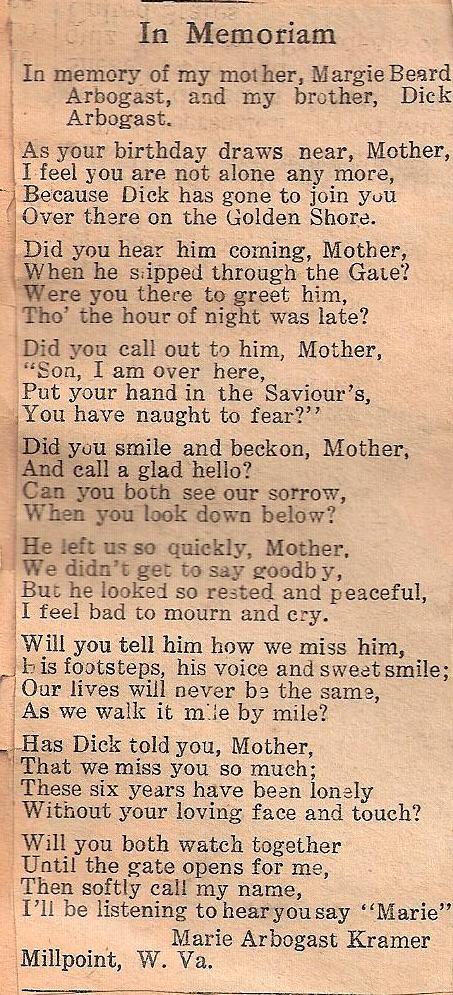 Dick Arbogast. As your birthday draws near, Mother, I feel you are not alone anymore, Because Dick has gone to join you, Over there on the Golden Shore. Did you hear him coming Mother, When he slipped through the gate? Were you there to greet him, Tho' the hour of night was late? Did you call out to him, Mother, "Son, I am over here. Put your hand in the Savior's, You have naught to fear?" Did you smile and beckon, Mother, And call a glad hello? Can you both see our sorry, When you look down below? He left us so quickly, Mother, We didn't get to say goodbye, But he looked so rested and peaceful, I feel bad to mourn and cry. Will you tell him how we miss him, his footsteps, his voice and sweet smile; Our lives will never be the same, as we walk it mile by mile? Has DIck told you Mother, That we miss you so much; These six years have been lonely, Without your loving face and touch? Will you both watch together, Until the gate opens for me, Then softly call my name, I'll be listening to hear you say "Marie". Marie Arbogast Kramer, Millpoint, W. Va. Ed Note : this must have been written about 1957. Bertie Marie Arbogast Kramer passed away on 19 Mar 2004, the gates open and angels singing loudly.. |