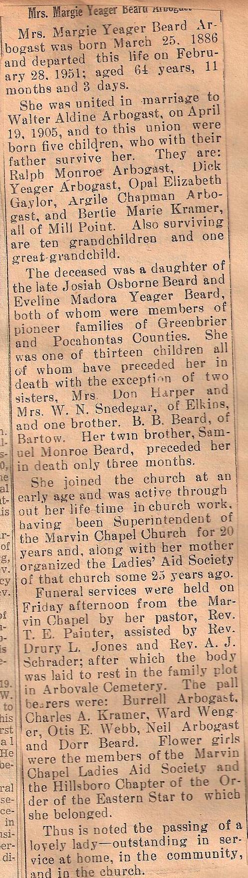 | Mrs. Margie Yeager Beard Arbogast was born on March 25, 1886, and departed this life on February 28, 1951,; aged 65 years, 11 months and 3 days. She was united in marriage to Walter Aldine Arbogast on April 19, 1905, and to this union were born five children, who with their father survive her. They are : Ralph Monroe Arbogast, Dick Yeager Arbogast, Opal Elizabeth Arbogast, and Bertie Marie Kramer, all of Mill Point. The deceased was a daughter of the late Josiah Osborne Beard and Eveline Yeager Beard, both of whom were members of the pioneer families of Greenbrier and Pocahontas Counties. She was one of thirteen children all of whom proceeded her in death with the exception of two sisters; Mrs. Don Harper of Elkins and one brother. B. B. Beard of Bartow. Her twin brother, Samuel Monroe Beard, preceded her in death only three months. She joined the church at an early age and was active throughout her life time in church work, having been Superintendent of the Marvin Chapel Church of 20 years and along with her mother, organized the Ladies Aid Society of that church some 25 years ago. Funeral services were held on Friday afternoon from the Marvin Chapel by her pastor, Rev. T. E. Painter, assisted by Rev. Drury L. Jones and Rev. A. J. Schader; after which the body was laid to rest in the Arbovale Cemetery. The pall bearers were: Burrell Arbogast, Charles A. Kramer, Ward Wenger, Otis E. Webb. Neil Arbogast, and Dorr Beard. Flower girls were the members of the Marvin Chapel Ladies Society and the Hillsboro Chapter of the order of the Easter Star to which she belonged. Thus is noted the passing of a lovely lady -- outstanding in service at home, in the community, and in the church. |