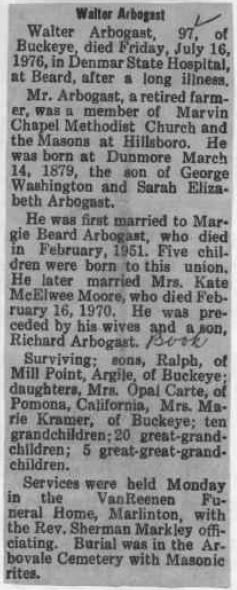 | Obituary - Walter Arbogast, 97 of Buckeye, died Friday, July 16, 1976 in Denmar State Hospital at Beard, after a long illness. Mr. Arbogast, a retired farmer, was a member of the Marvin Chapel Methodist Church and the Masons of Hillsboro. He was born at Dunmore March 14, 1879, the son of George Washington and Sarah Elizabeth Arbogast. He was married to Margie Beard Arbogast, who died in February 1951. Five children were born of this union. He later married Mrs. Katea McElwee Moore, who died February 16, 1970. He was preceded by his wives and a son, Richard Arbogast. Surviving : sons, Ralph of Mill Point, Argile of Buckeye; daughters Mrs. Opal Carte of Pomona, California, Mrs. Marie Kramer, of Buckeye; ten grandchildren; 20 great-grandchildren; 5 great-great-grandchildren. Services were held Monday in the VanReenen Funeral Home, Marlinton, with the Rev. Sherman Markley officiating. Burial was in the Arbovale Cemetery with Masonic rites. |
