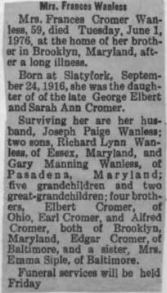 | Obituary - Mrs. Mary Wanless, 79, of Cass, died Thursday April 27, 1978, in an Elkins Hospital. Born January 18, 1899, at Hillsboro, she was the daughter of Burke and Lucy Beard Hill. Survivors include her husband, Harry Wanless; one foster daughter, Arlene Ralston, of Virginia, and two foster sons, Ray and Bobby Kelley, both of Belington. Services were held Sunday at two pm in the Cass United Methodist Chruch with the Rev. Greg Lewis officiating. Burial was in the Wanless Cemetery. |
