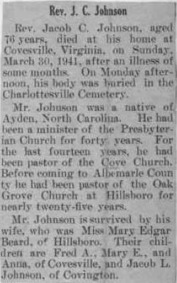 | Obituary - Rev. Jacob C. Johnson, aged 76 years, died at his home at Cotesville, Virginia, on Sunday March 30, 1941, after an illness of some months. On Monday afternoon, his body was buried in the Charlottesville Cemetery. Mr. Johnson was a native of Ayden, North Carolina. He had been a minister of the Presbyterian Church for forty years. For the last fourteen years he had been pastor of the Cove Church. Before coming to Albemarie County he had been pastor of the Oak Grove Church at Hillsboro for nearly twenty-five years. Mr. Johnson is survived by his wife, who was Miss Mary Edgar Beard of Hillsboro. Their children are Fred. A., Mary E. and Anna of Covesville, and Jacob L. Johnson of Covington. |