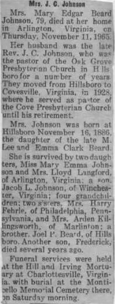| Obituary - Mrs. Mary Edgar Beard Johnson, 79, died at her home in Arlington, Virginia, on Thursday, November 11, 1965. Her husband was the late Rev. J. C. Johnson, who was the pastor of the Oak Grove Presbyterian Church in Hillsboro for a number of years. They moved from Hillsboro to Covesville, Virginia in 1928, where he served as Pastor of the Cove Presbyterian Church until his retirement. Ms. Johnson was born in Hillsboro November 16, 1886, the daughter of the late M. Lee and Emma Clark Beard. She is survived by two daughters, Miss Mary Emma Johnson and Mrs. Lloyd Langford of Arlington, Virginia; four grandchildren, two sisters, Mrs. Harry Fehrle of Philadelphia, Pennsylvania and Mrs. Arden Killingworth of Marlinton, a brother Joel P. Beard of Hillsboro. Another son, Frederick, died several years ago. Funeral services were held at the Hill and Irving Mortuary at Charlottesville, Virginia, with burial at the Monticello Memorial Cemetery there, on Saturday morning. |