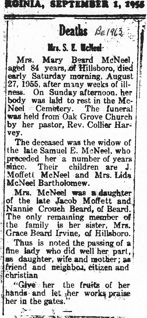 Obituary : Mrs. Mary Beard McNeel , aged 84 years, of Hillsboro, died early Saturday morning, August 27, 1955, after many weeks of illness. On Sunday afternoon her body was laid to rest in the McNeel Cemetery. The funeral was held from Oak Grove Church by her pastor, Rev. Collier Harvey. The deceased was the widow of the late Samuel E. McNeel who preceded her a number of years since. Their children are J. Moffett McNeel and Mrs. Lida NcNeel Bartholomew. Mrs. McNeel was the daughter of the late Jacob Moffet and Nannie Crouch Beard of Beard. The only remaining member of her family is Mrs. Grace Beard Irvine, of Hillsboro. Thus is noted the passing of a fine lady who did well her part, a daughter, wife and mother; as friend and neighbor, citizen and Christian. Give her the fruits of her hands and let her works praise her in the gates. |