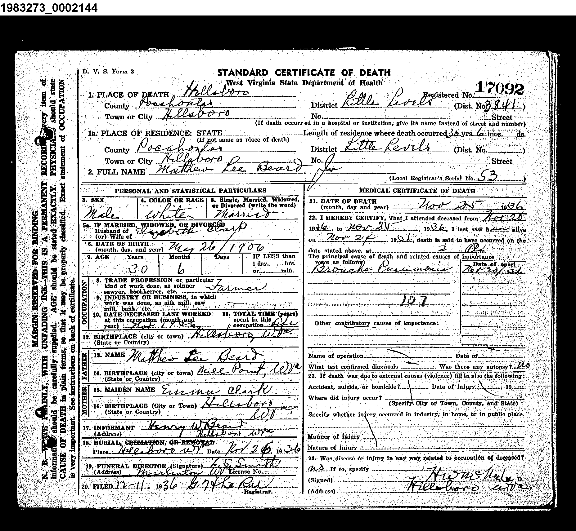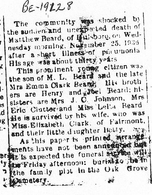 | Obituary : The community was shocked by the sudden and unexpected death of Matthew Beard of Hillsboro, on Wednesday morning, November 25, 1935 after a short illness of pneumonia. His age was about thirty years. This prominent young citizen was the son of M. L. Beard and the late Mrs. Emma Clark Beard. his brothers are Henry and Joel Beard; his sisters are Mrs. J.C. Johnson, Mrs. Eric Clutter, and Mrs. Leila Beard. he is survived by his wife, who was Miss Elizabeth Clark of Fairmont, and their little daughter Betty. As this paper is printed, arrangements have not been announced but it is expected he funeral service will be Friday afternoon; burial to be in the family plot in the Oak Grove Cemetery. |