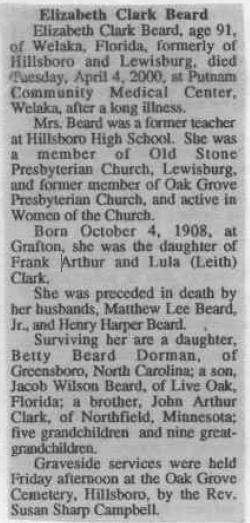 | http://www.pocahontastimes.com/obit0413.htm - Elizabeth Clark Beard, age 91, of Welaka, Florida, formerly of Hillsboro and Lewisburg, died Tuesday, April 4, 2000, at Putnam Community Medical Center, Welaka, after a long illness. Mrs. Beard was a former teacher at Hillsboro High School. She was a member of Old Stone Presbyterian Church, Lewisburg, and former member of Oak Grove Presbyterian Church, and active in Women of the Church. Born October 4, 1908, at Grafton, she was the daughter of Frank Arthur and Lula (Leith) Clark. She was preceded in death by her husbands, Matthew Lee Beard, Jr., and Henry Harper Beard. Surviving her are a daughter, Betty Beard Dorman, of Greensboro, North Carolina; a son, Jacob Wilson Beard, of Live Oak, Florida; a brother, John Arthur Clark, of Northfield, Minnesota; five grandchildren and nine great-grandchildren. Graveside services were held Friday afternoon at the Oak Grove Cemetery, Hillsboro, by the Rev. Susan Sharp Campbell. |